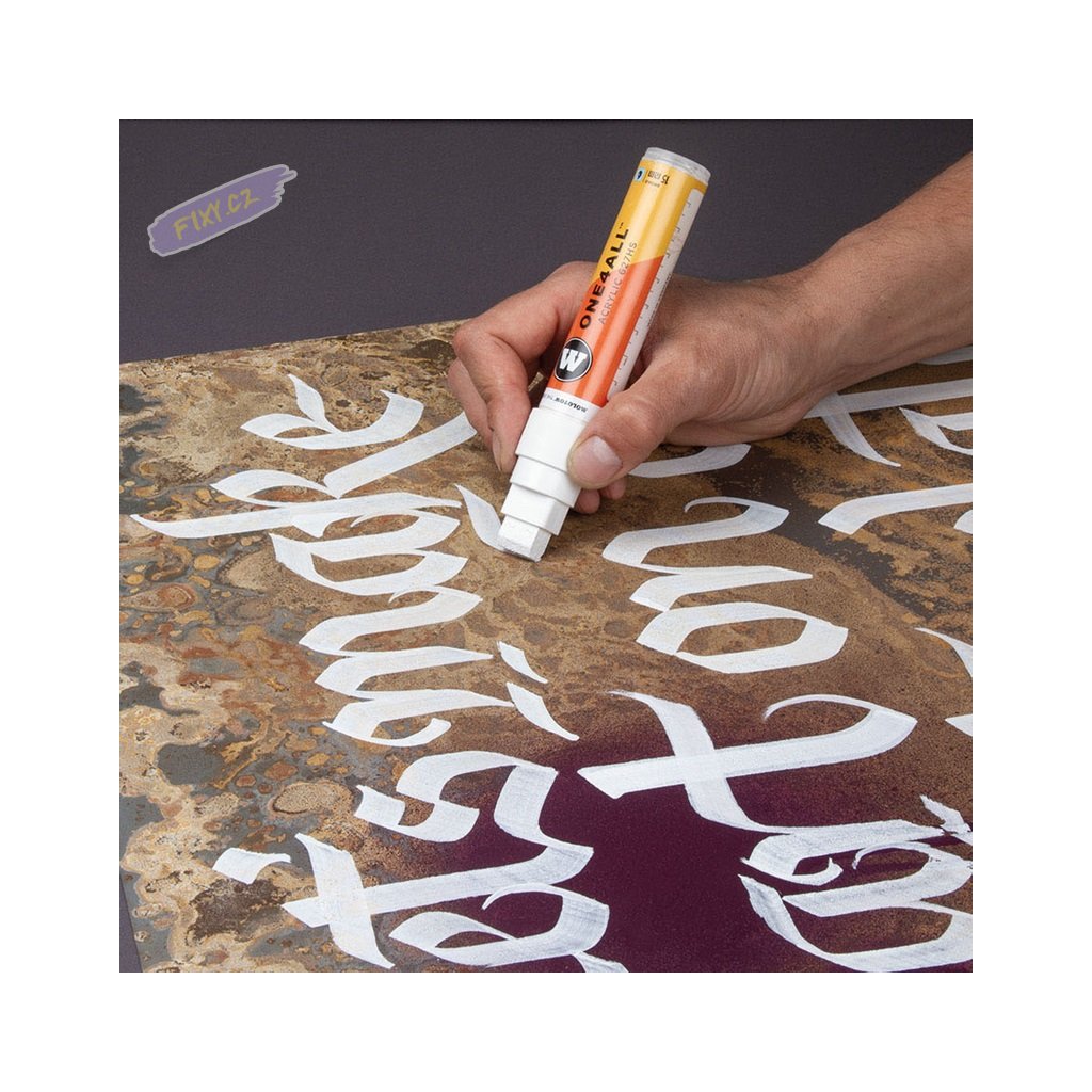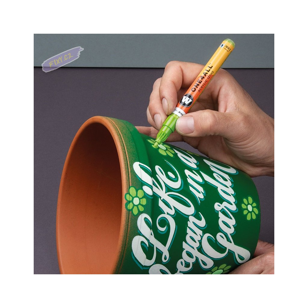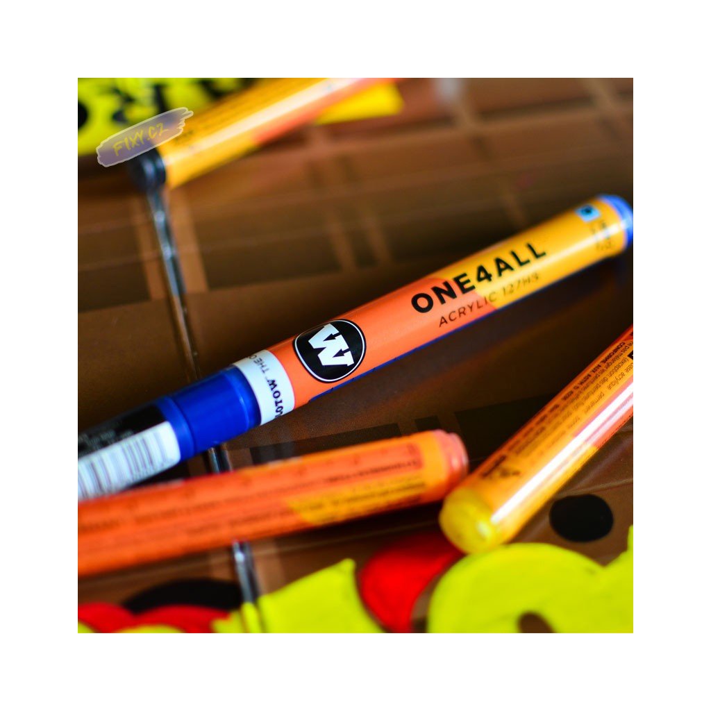 Pumpovací akrylová fixa Molotow ONE4ALL je vybavena vyměnitelným hrotem a je k dispozici až v 76 různých barvách a po vypsání ji lze znovu naplnit inkoustem. Vysoce krycí a permanentní inkoust je odolný proti UV záření a trvanlivý téměř na všech površích. Je zkonstruován tak, aby jeho popisovače šli znovu naplnit a byly vždy spolehlivé a funkční. Ať už malujete na dřevo, plátno, kov, zeď, sklo nebo textil - nic není nemožné. Individuální barevné odstíny lze snadno namíchat díky náhradním inkoustům. Efektové barvy (fluorescentní a metalické) dělají vybarvování ještě atraktivnější a neměly by chybět v sortimentu žádného umělce. Pro zvýšení odolnosti je vhodné použít fixační laky v matu nebo lesku. Molotow fixy jsou vybaveny patentovaným kapilárním systémem, který umožňuje plynulou distribuci barvy do hrotu a její konstantní rozložení.