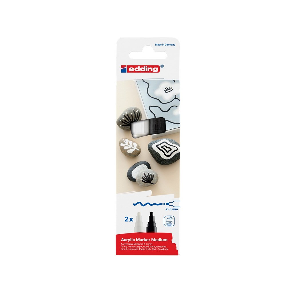 Sada 2 akrylových popisovačů Edding 5500 EF pro spontánní kreativitu na světlých i tmavých površích materiálů jako je plátno, malířský papír, hladké dřevo, terakota a kámen. Vysoce kvalitní pigmentovaná akrylová barva na bázi vody je po zaschnutí permanentní, světlostálá a bez zápachu. Vhodné pro kreativní vyjádření umělců i laiků. Barva ve formě pumpovacího fixu se snadno nanáší. Popisovač je vždy připraven k použití, nejsou potřeba žádné štětce a další potřeby. Stačí otevřít, zapumpovat a rovnou malovat. Ventilový systém umožňuje rovnoměrný tok inkoustu. Sada obsahuje poloprůhlednou bílou a vysoce krycí černou barvu. Odolný kulatý hrot se šířkou stopy 0,7-1 mm je ideální na kreslení kontur a dalších detailů s lehkostí. Lze kombinovat s ostatními akrylovými popisovači a spreji Edding 5200. Použití je velmi jednoduché: sejměte ochrannou fólii, před odstraněním víčka popisovač důkladně protřepejte, zapumpujte hrotem popisovače nejlépe o podložku s papírem, dokud hrot dostatečně nenasákne inkoustem. Skladujte vodorovně a při pokojové teplotě.