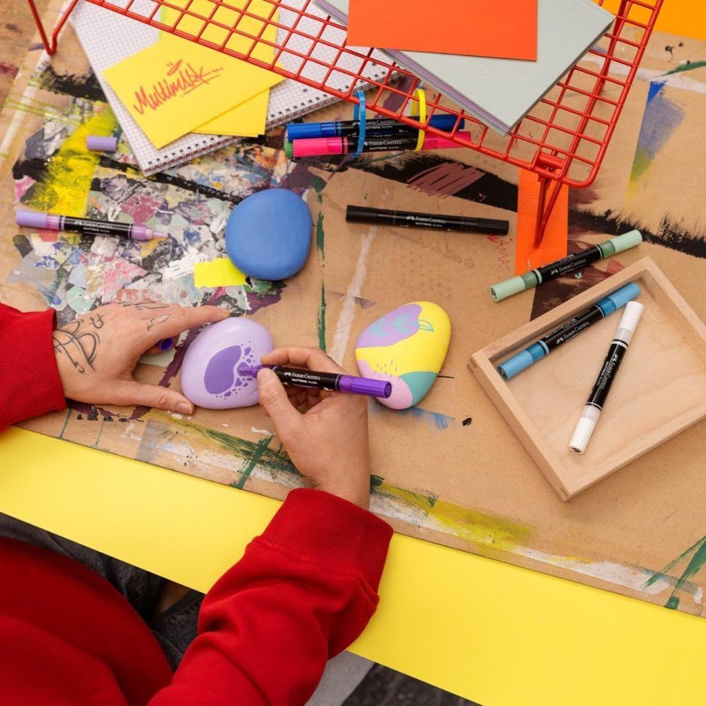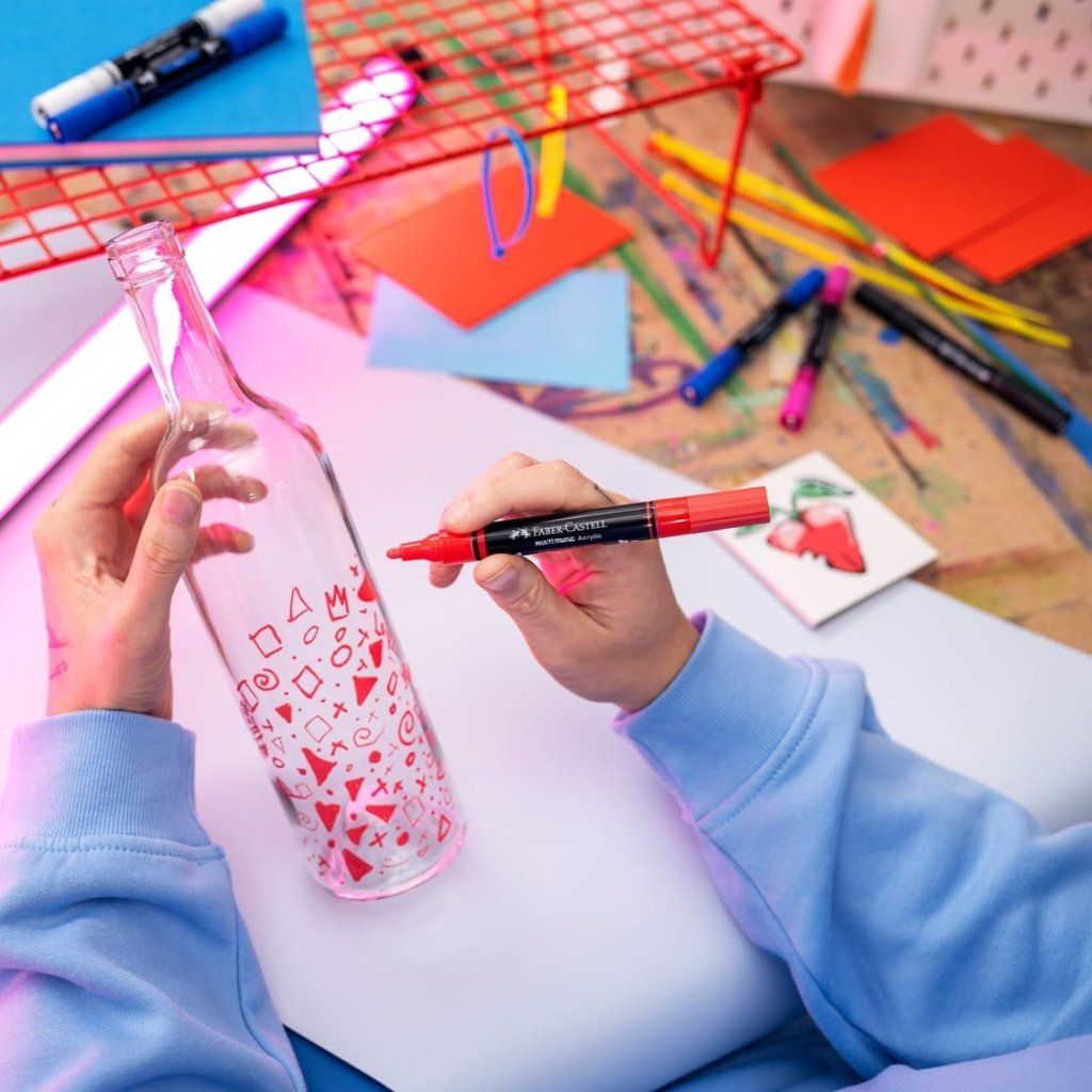 Oboustranný akrylový popisovač FABER-CASTELL Multimark se dvěma hroty: tenký pevný pro detailní práci a silnější kulatý pro výrazné tahy. Ideální popisovač pro použití na téměř všechny povrchy, jako je papír, kov, dřevo, keramika, sklo, kámen a textil. Vhodný na savé i nesavé materiály. Vyměnitelné hroty umožňují snadnou údržbu a dlouhodobě přesné kreslení.