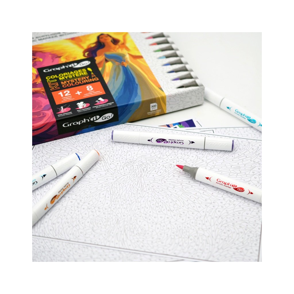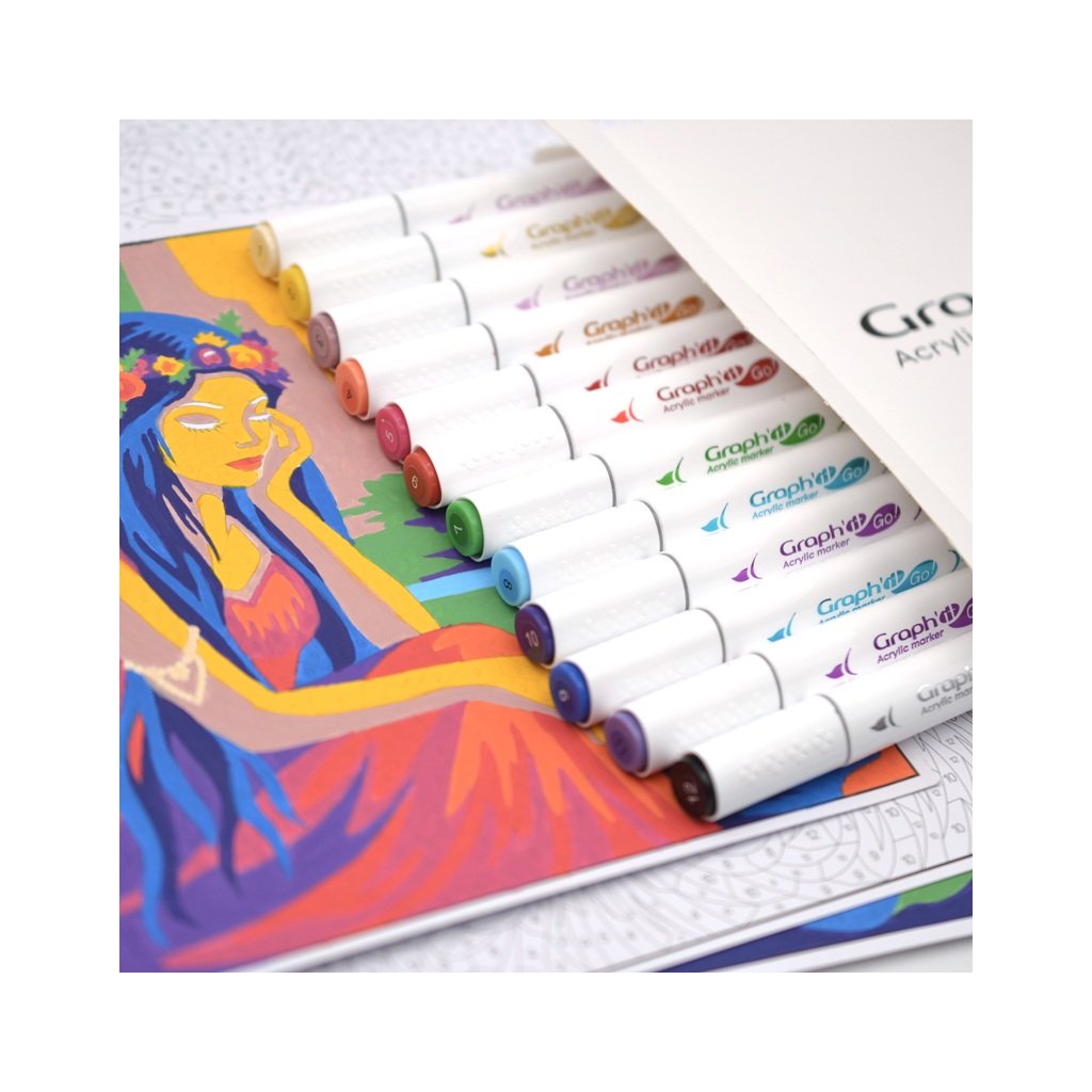 Oboustranné akrylové fixy GRAPH’IT GO! s kvalitními japonskými polyesterovými hroty. Na jedné straně má měkký štětcový hrot a na druhé straně pevný kulatý hrot. Je ideální pro všechny milovníky volnočasových kreseb, tajemného vybarvování nebo kreativních tužeb. Univerzální použití na dřevo, sklo, kámen, kov, papír a další. Jeho pigmentovaný inkoust na vodní bázi je neprůhledný, ale neprosakuje papírem.