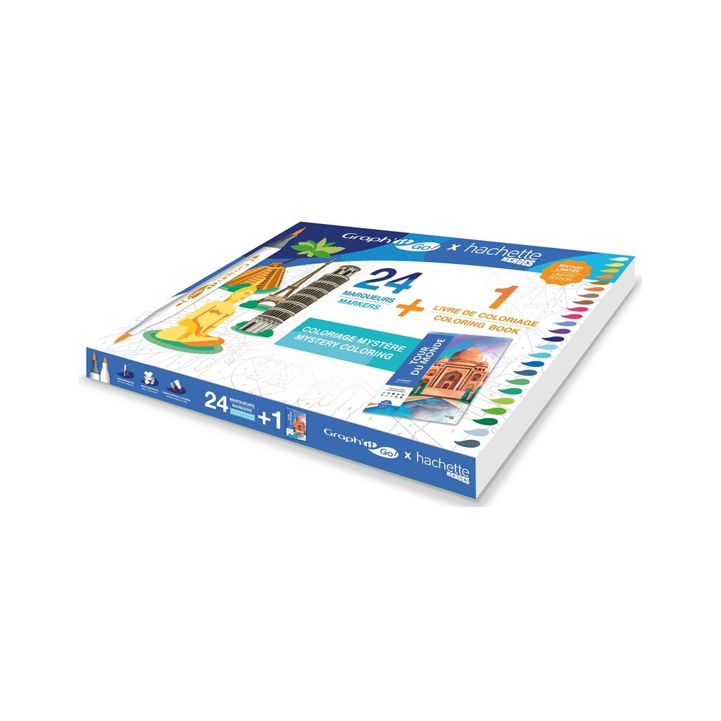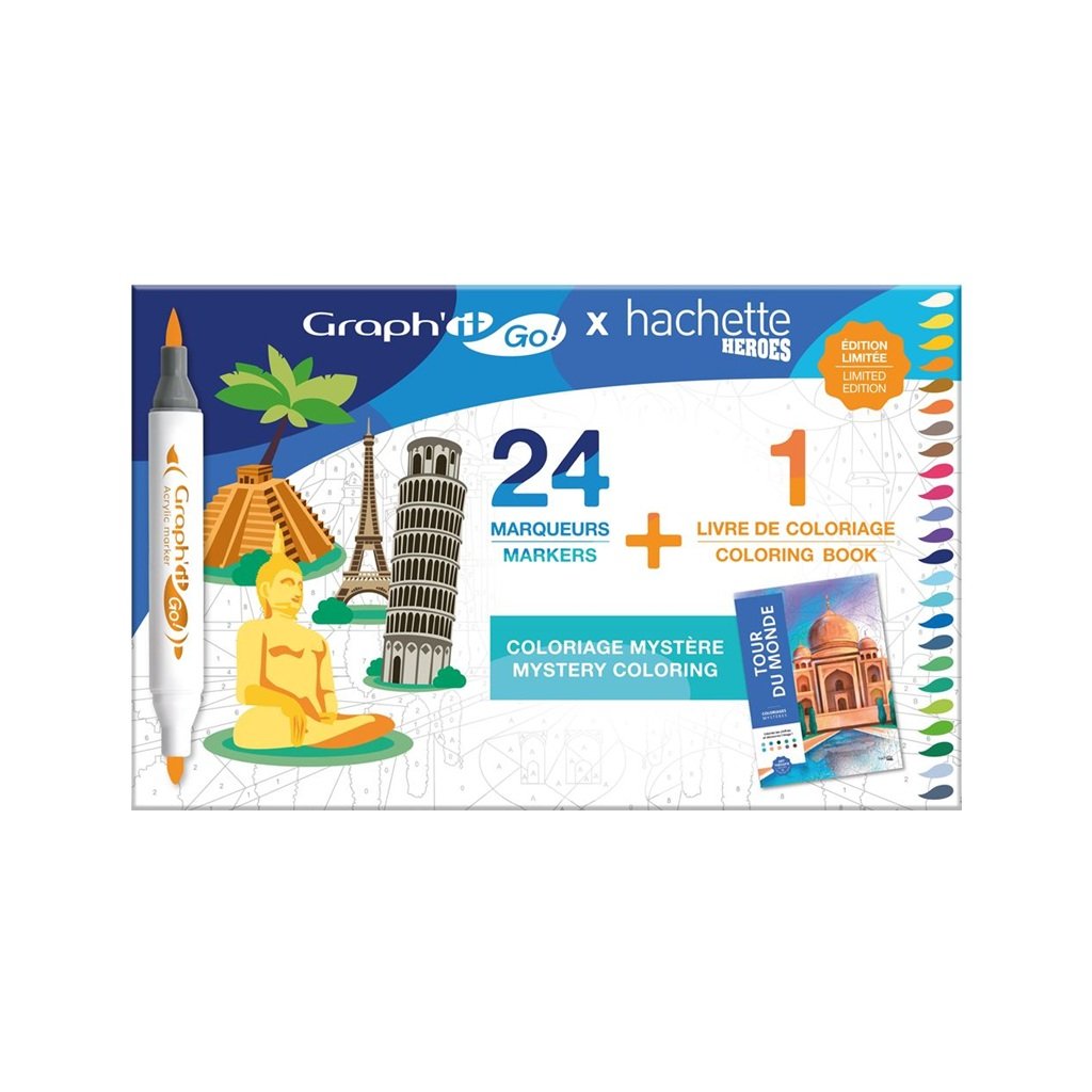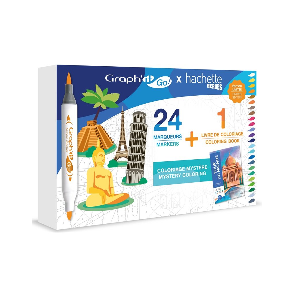 Akrylové fixy GRAPH'IT oboustranné Brush & Fine, 24 ks Around The World + 72 omalovánek