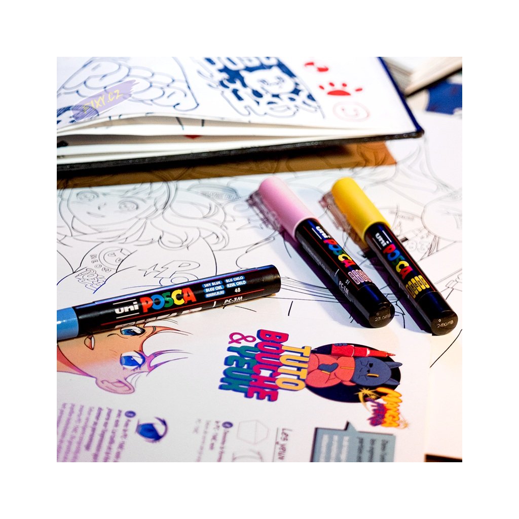 Nepostradatelný akrylový popisovač UNI POSCA je oblíbený jak profesionály, tak začátečníky. Obsahuje jedinečný akrylový inkoust, jehož složení se od svého vytvoření nezměnilo, je mimořádně bohatý na pigmenty a je extrémně odolný vůči atmosférickým podmínkám a plynutí času. Jeho matné barvy mají velkou sytost - umělci je milují pro svá díla a fandové jsou ohromeni „magickým“ efektem Posca. Obsahuje jedinečný ventilový mechanismus, který zaručuje perfektní utěsnění a šetří barvu v průběhu času. Stejný mechanismus se používá k naplnění popisovačů Posca pro použití a k opětovnému nasycení hrotu tak často, jak je to nutné během tvoření. Barvy jsou vrstvitelné, mísitelné, vodou rozpustné, odolné vůči povětrnostním vlivům a nabízejí neomezené kreativní možnosti.