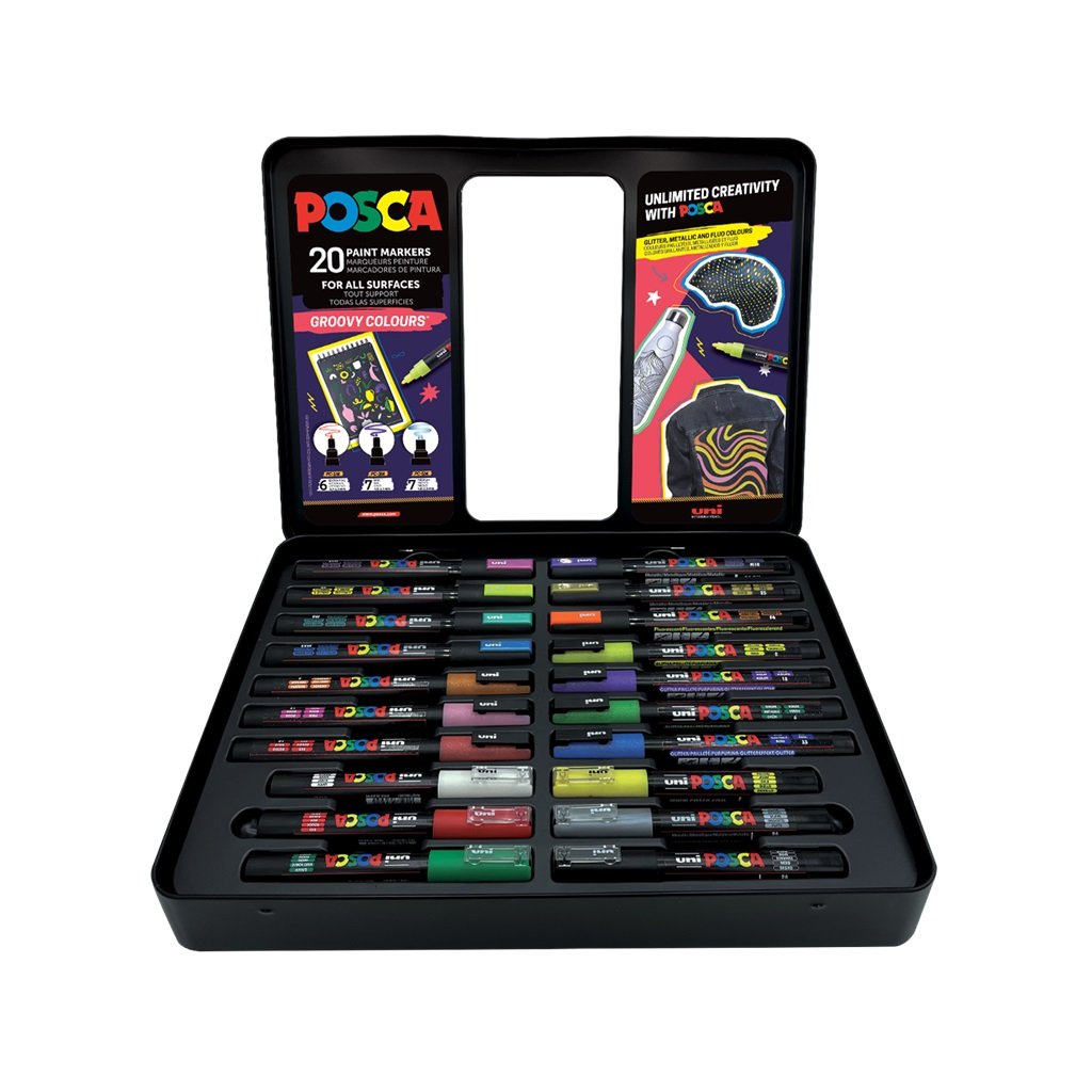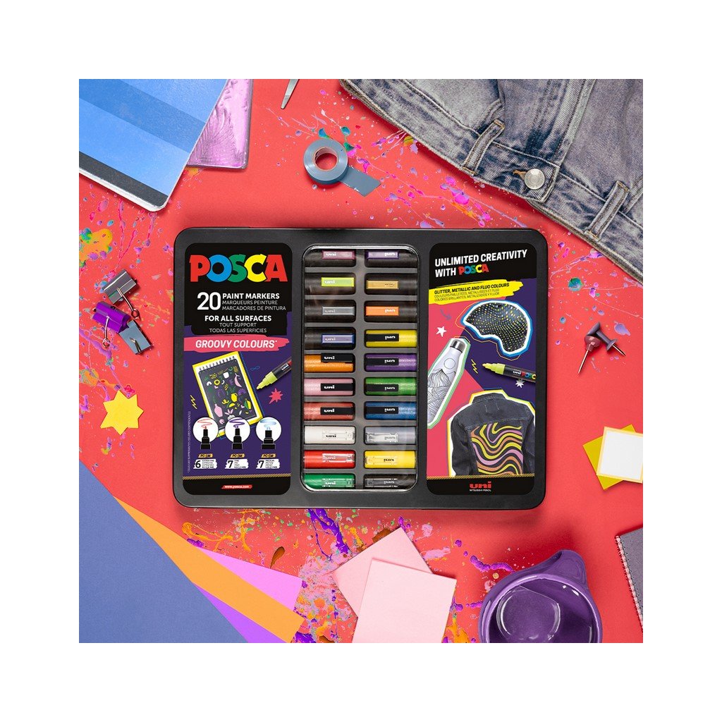 Akrylové fixy UNI POSCA Groovy Colours, 20 ks v kovové krabičce