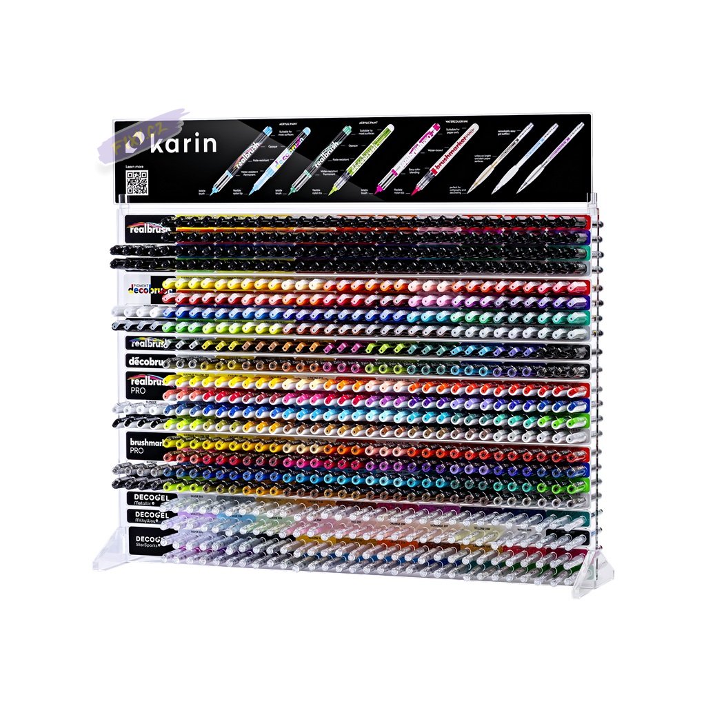 Stojan KARIN naplněný 692 kusy napříč všemi produkty této značky. Akvarelové fixy BrushMarker a RealBrush, akrylové fixy DecoBrush a RealBrush i kompletní řada gelový per DecoGel.
