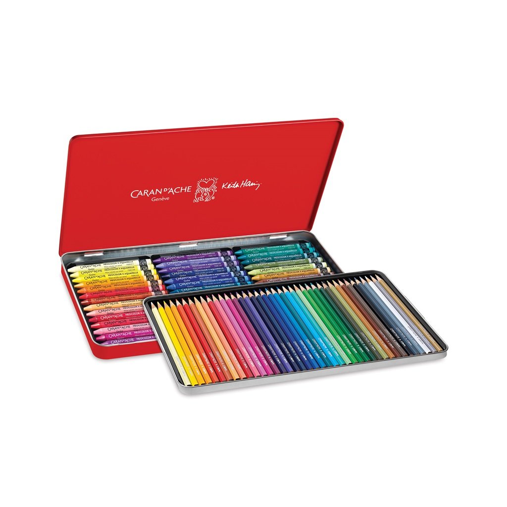 Akvarelové pastelky a pastely Keith Haring CARAN D'ACHE, 82 ks v kovové krabičce