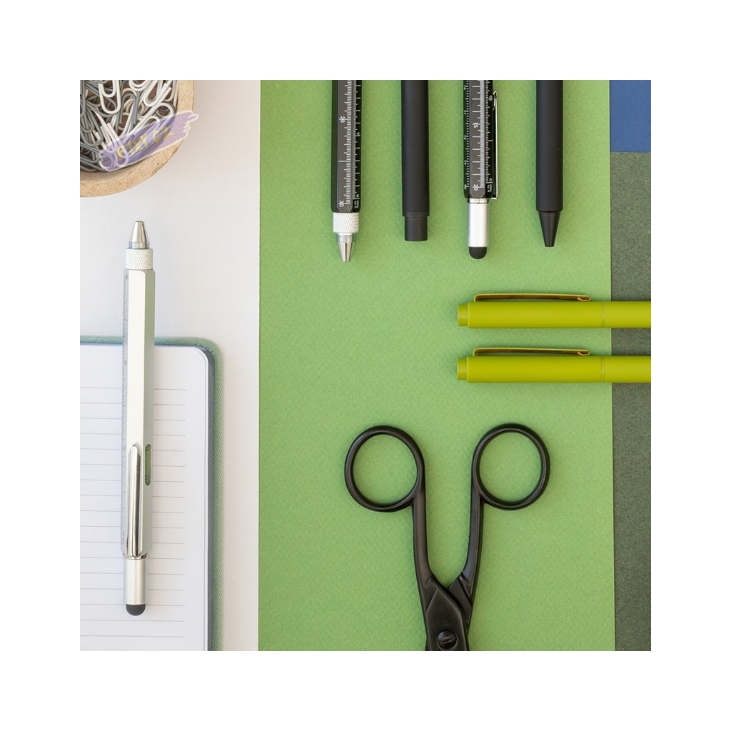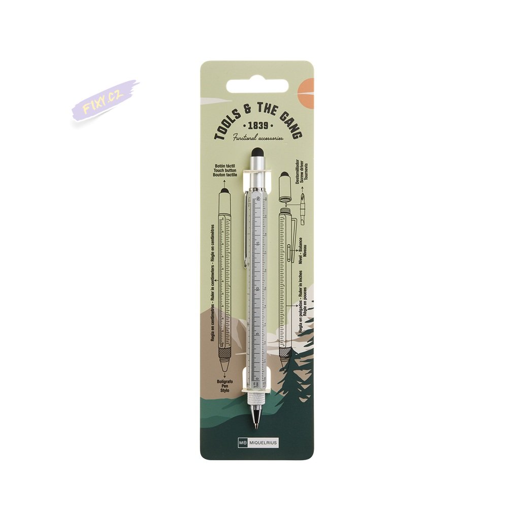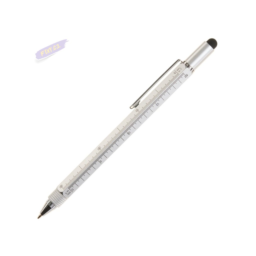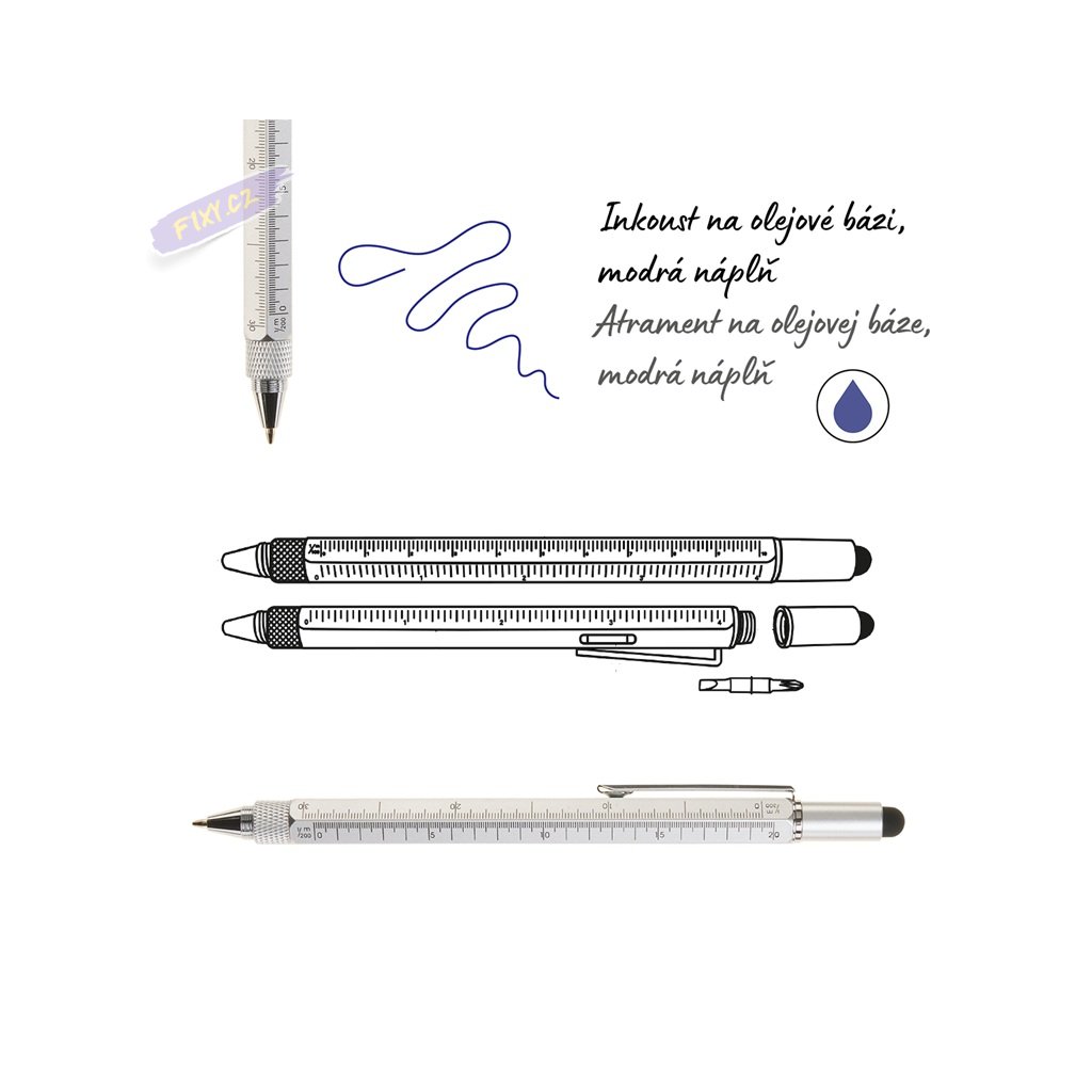 Multifunkční kuličkové pero spojuje elegantní psací nástroj s pěti užitečnými funkcemi, které využijete doma, v kanceláři i na cestách. Skvělé vychytávky, které máte vždy po ruce. Kromě kuličkového pera obsahuje pravítko v centimetrech i palcích, vodováhu, plochý a křížový šroubovák a dotykový stylus pro smartphony a tablety. Modrá náplň, inkoust na olejové bázi, který hladce klouže po papíru.