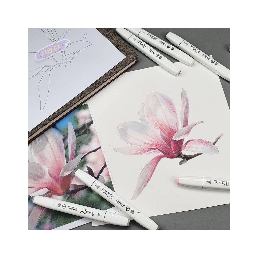 Štětečkový hrot na jedné straně a široký zkosený hrot na straně druhé popisovače TOUCH Twin Brush Marker nabízí rozsah tlouštěk čar větší než kdykoliv předtím. Ergonomicky tvarované tělo obdélníkového tvaru braní kutálení se po pracovní ploše a umožňuje pohodlné odložení bez neúmyslných šmouh. Speciálně navržený bezpečnostní uzávěr pevně drží na popisovači a zabraňuje poškození hrotu. Twin Marker obsahuje inkoust na bázi alkoholu, který je rychleschnoucí, netoxický a vodě odolný.