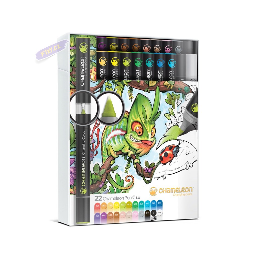 Tónovací fixy Chameleon - 20 barev, blender, detailní pero, multifunkční krabička, instruktážní brožura v AJ. Chameleon Color Tones Pens je inovativní fix na alkoholové bázi, který umožní měnit tón v jedné barvě pomocí integrovaného blenderu v těle fixu. Oboustranný - štěteček a kulatý hrot. S fixem můžete vytvářet 3D efekty, barevné přechody, zvýrazňovat, stínovat a blendovat.
