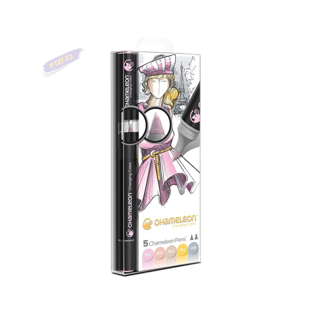 Tónovací fixy Chameleon - 5 barev v pastelových tónech + 2 náhradní štětečkové hroty. Chameleon Color Tones Pens je inovativní fix na alkoholové bázi, který umožní měnit tón v jedné barvě pomocí integrovaného blenderu v těle fixu. Oboustranný - štěteček a kulatý hrot. S fixem můžete vytvářet 3D efekty, barevné přechody, zvýrazňovat, stínovat a blendovat.