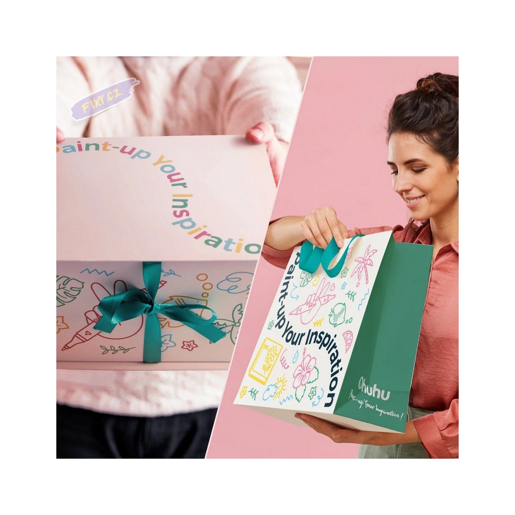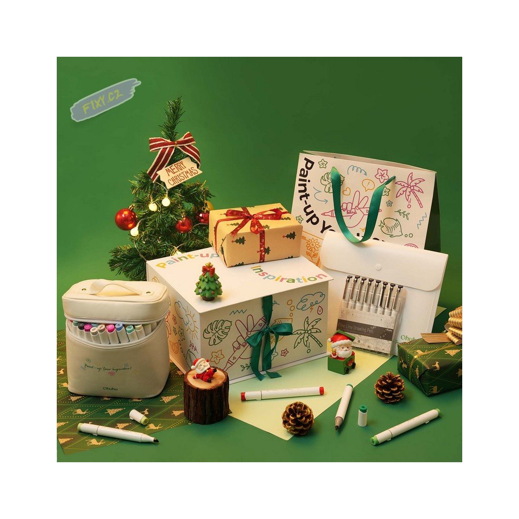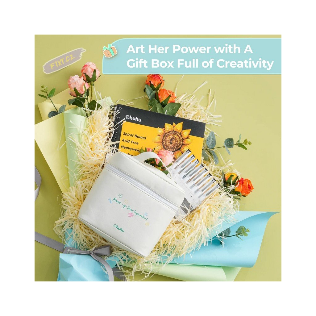Dárková sada OHUHU je perfektní dárek pro každého, kdo miluje ilustraci, skicování, vybarvování, malování a kreslení. Sada obsahuje 72 alkoholových fix OHUHU Brush & Chisel, skicář, sadu 8 linerů pro tenké linky a 16 omalovánek, které poskytují všechny základní potřeby pro nadšence do alkoholových fixů. Součástí jsou také roztomilé samolepky. Bílé pouzdro fix je nyní vylepšeno o elegantní, měkký a snadno čistitelný PU materiál.