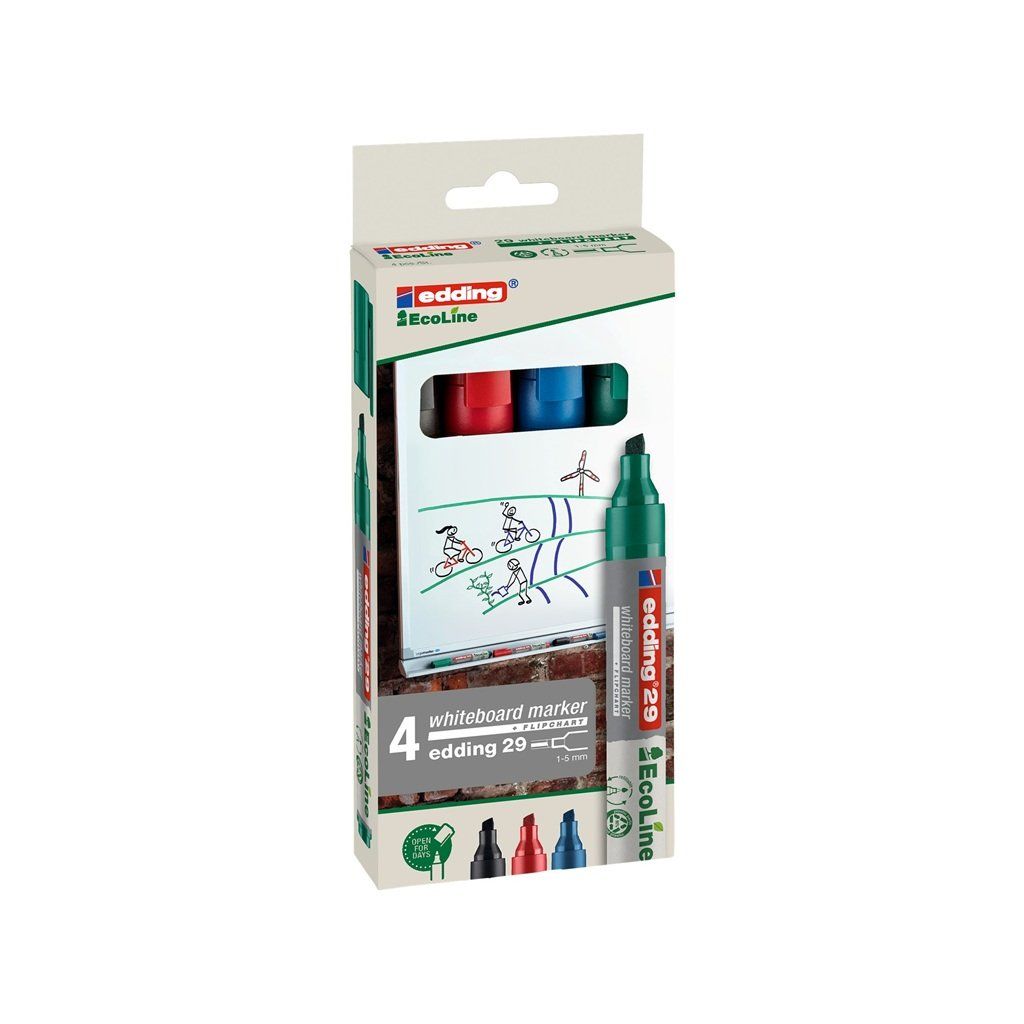 Popisovač na bílé tabule Edding 29 z ekologické řady EcoLine je vyroben nejméně z 90% z recyklovaných materiálů. Vyměnitelný hrot a možnost znovu naplnění vypsaného popisovače pomáhá snižovat množství odpadu, takže je šetrný k životnímu prostředí. Popisovač je vhodný i na flipcharty. Sytá stopa rychle zasychá a je zasucha stíratelná. Díky inkoustu cap-off vydrží popisovač bez víčka i několik dní, aniž by vyschl. Víčko je opatřeno klipem, který zabrání skutálení popisovače z vodorovného povrchu.