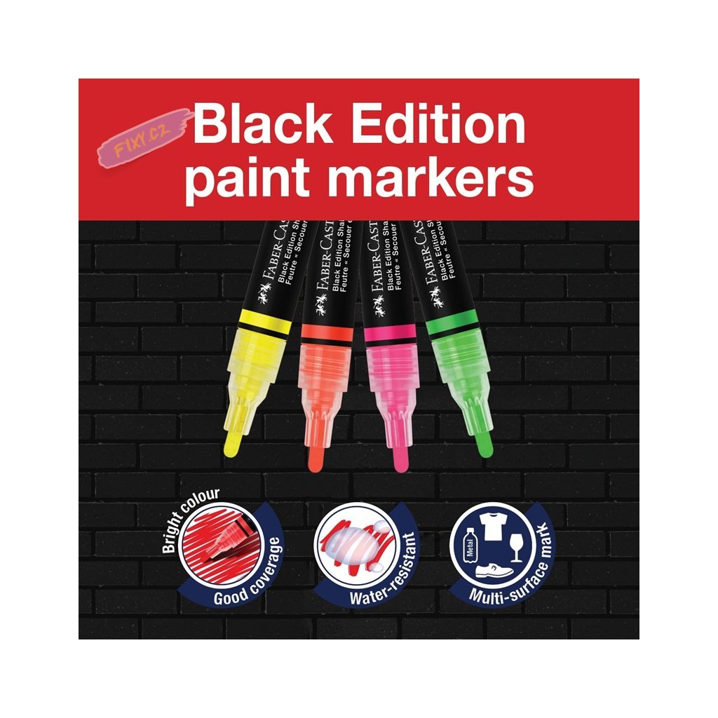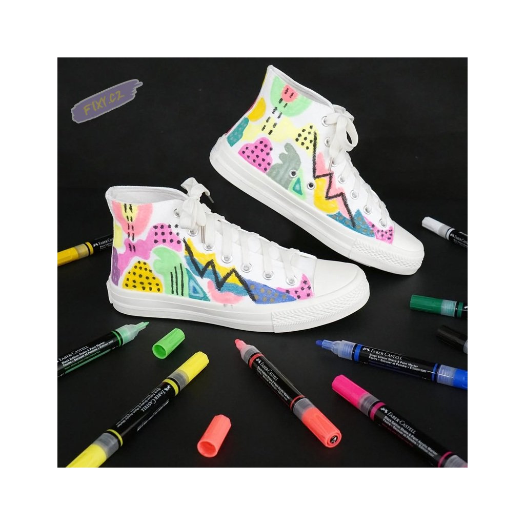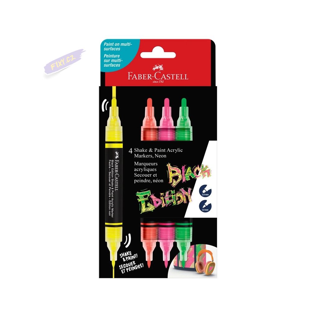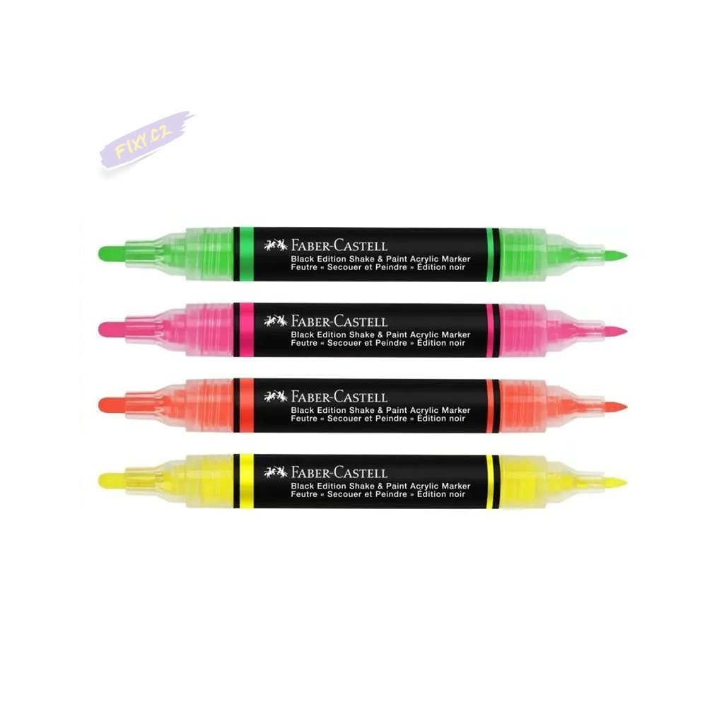 Oboustranný moderní popisovač FABER-CASTELL Shake & Paint s akrylovým inkoustem. Díky vysoce pigmentovanému neprůhlednému akrylovému inkoustu na vodní bázi tyto fixy odemykají svobodu sebevyjádření a dokáží proměnit povrchy od lahví na pití až po batohy s výraznými designy, které vyčnívají z davu.