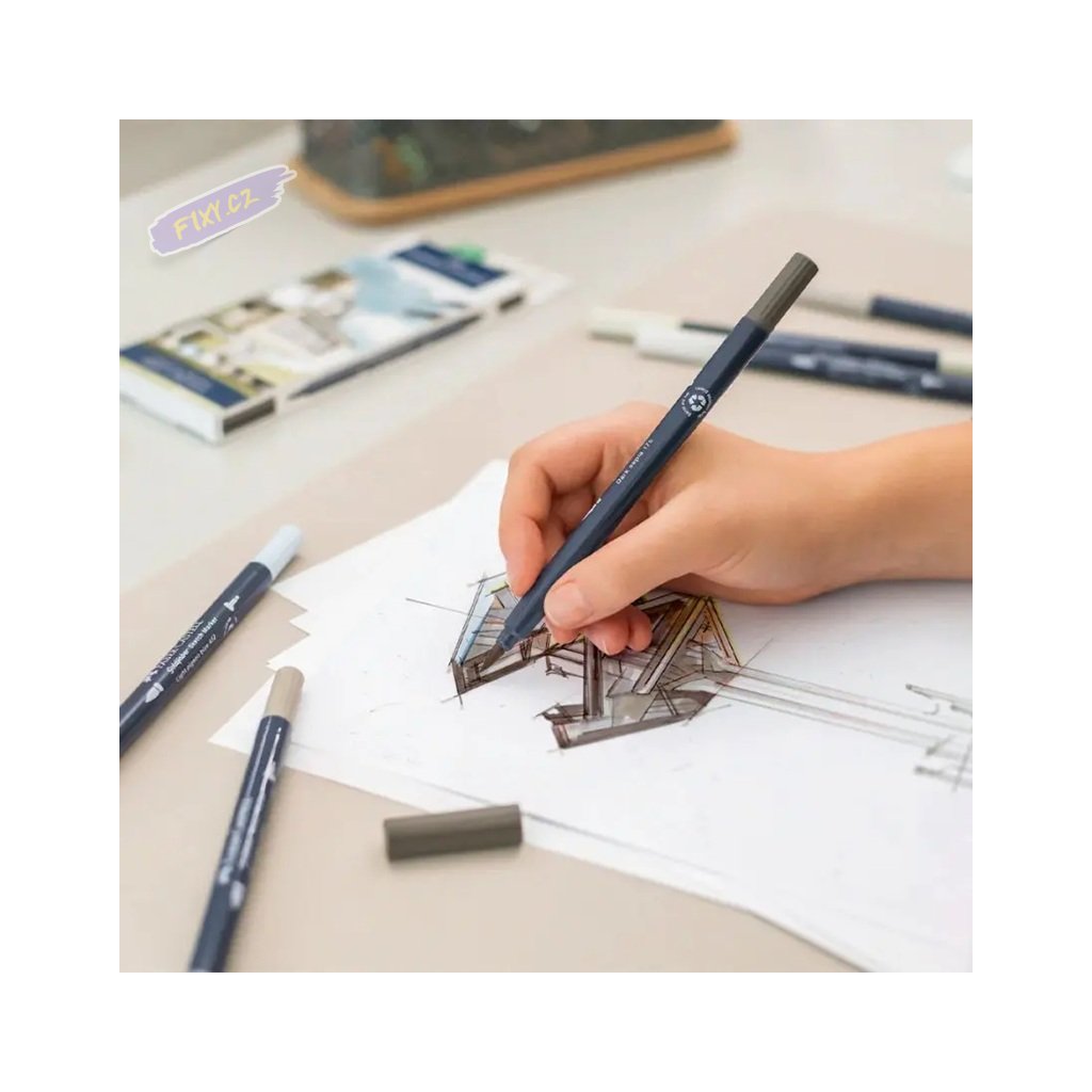 Oboustranný moderní popisovač Goldfaber Sketch Dual Marker s inkoustem na bázi alkoholu. Popisovač má měkký štětec pro uměleckou práci a tenký hrot v kovovém pouzdře pro jemné linky kontur a detailů.