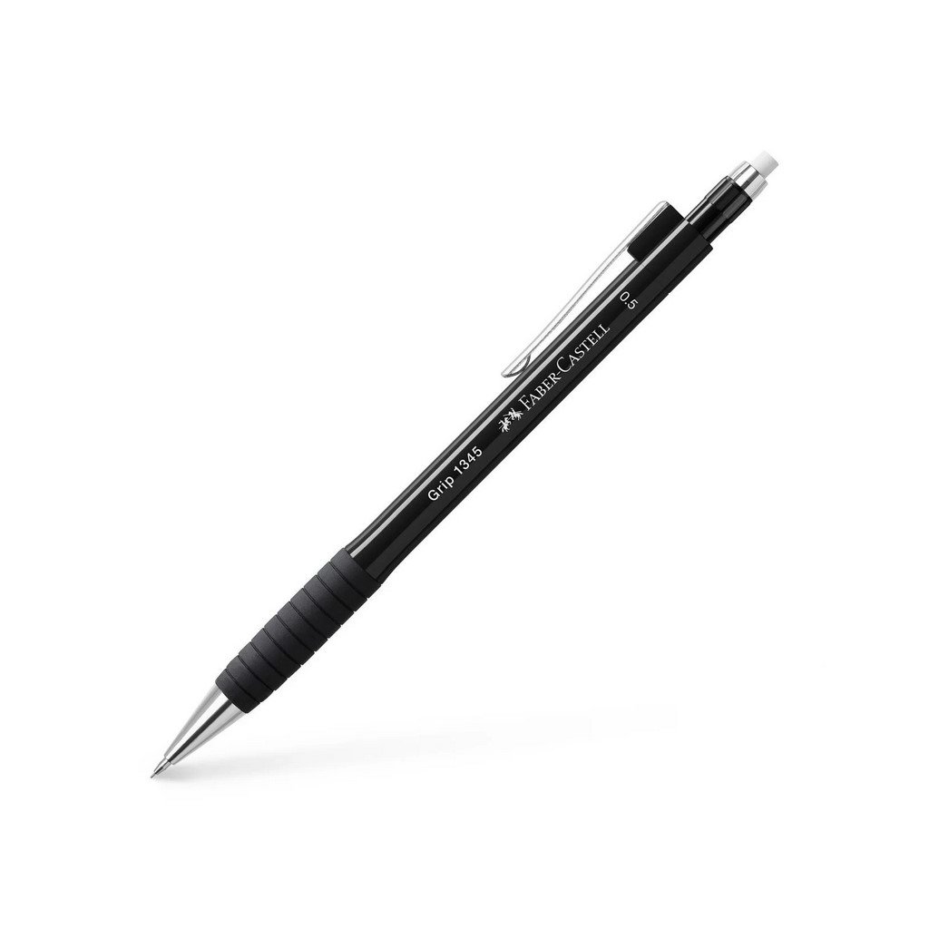 Mechanická tužka Faber-Castell Grip 1345 s extra dlouhou výsuvnou pryží. Má inovační technologii vysouvání hrotu bez stlačování. Hrot se vysouvá podle psaní v optimálním rozsahu.