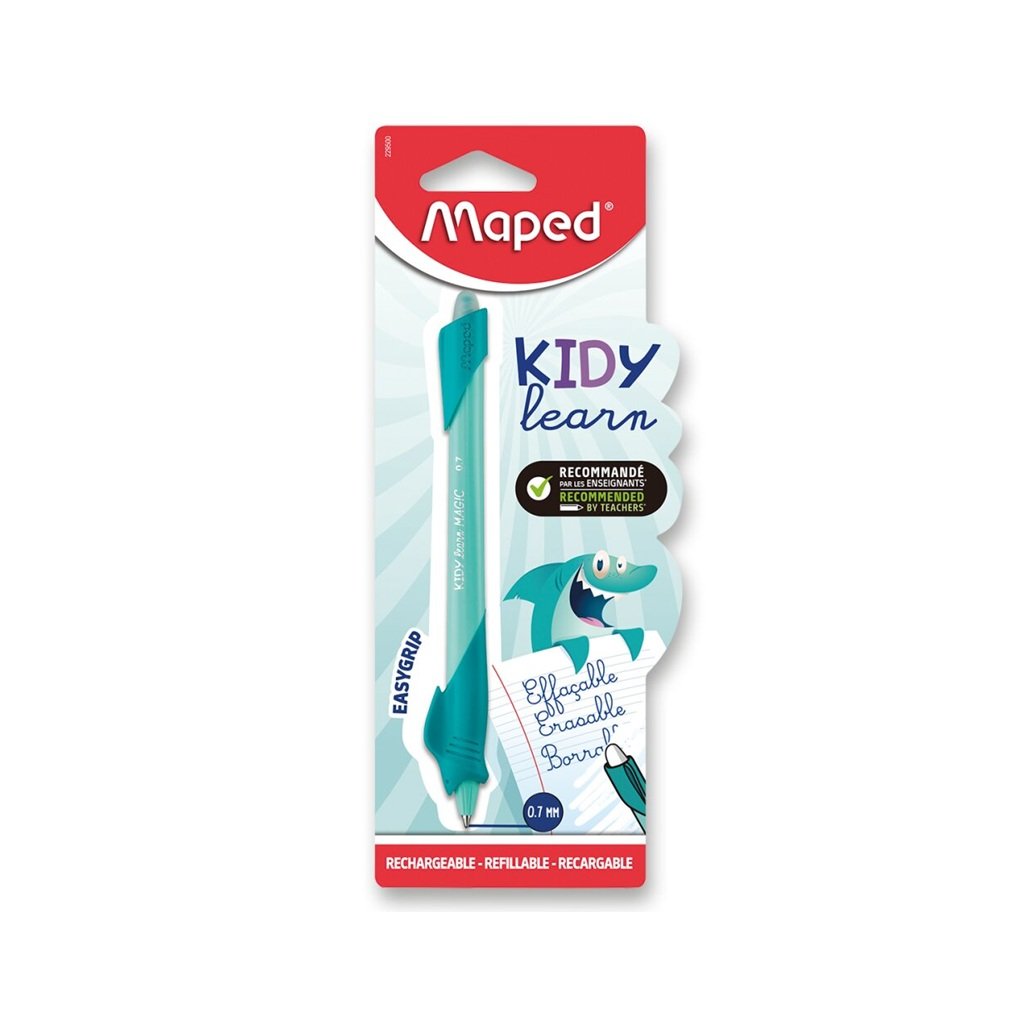 Gumovací pero MAPED Kidy Learn s mazacím inkoustem, který lze snadno vymazat třením. Pero je navrženo pro podporu správného úchopu, má měkkou ergonomickou úchopovou zónu. Pero je znovu plnitelné a kompatibilní se standardními gumovacími náplněmi. Je vhodné pro praváky i leváky a pro děti od 6 let.