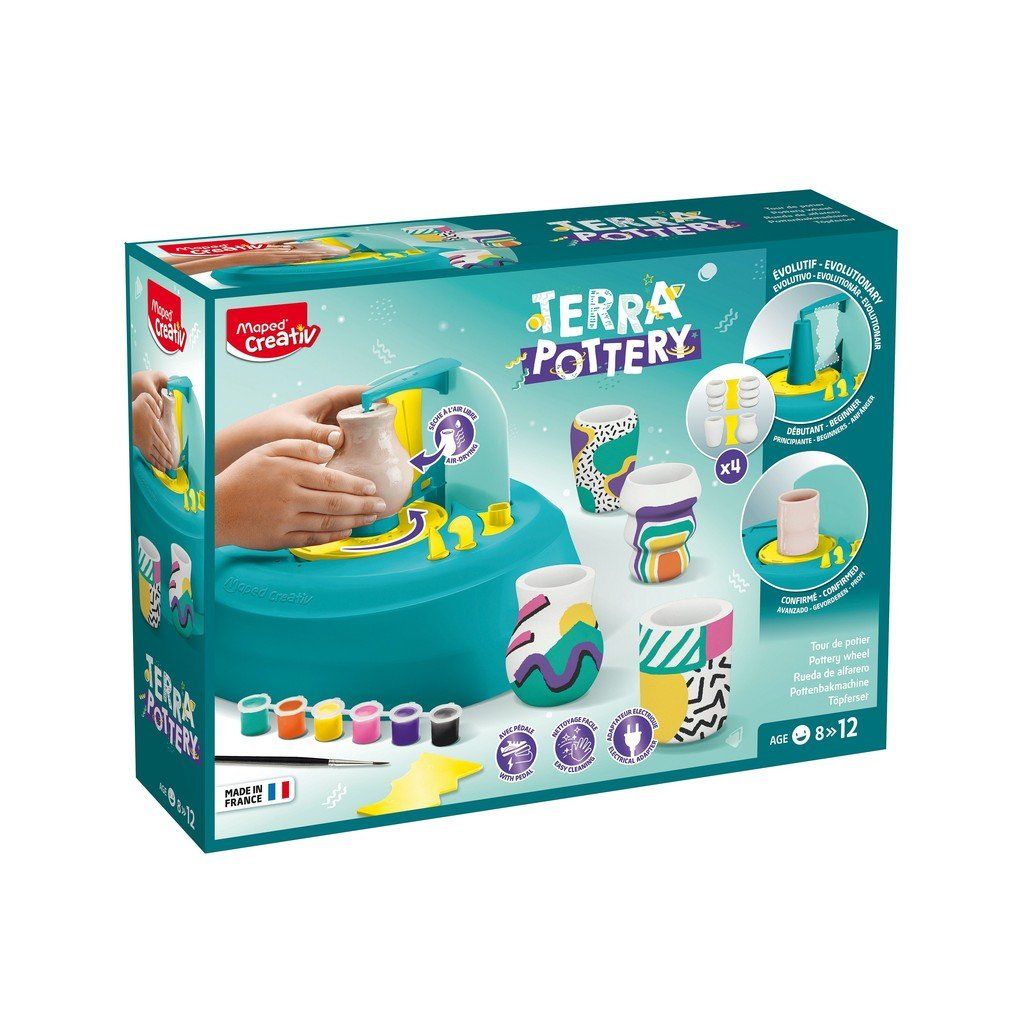 Kreativní keramická sada Terra Pottery obsahuje skutečný hrnčířský kruh s nožním pedálem k ovládání rychlosti otáčení a s výkonným motorem, který umožňuje vytvářet originální, jemně zdobenou keramiku bez vypalování. Možnost výběru ze dvou úrovní obtížnosti dle zručnosti dítěte - tj. tvorba se šablonou (4 tvary) nebo bez šablony. Ideální pro rozvoj dětské zručnosti a tvůrčích smyslů.