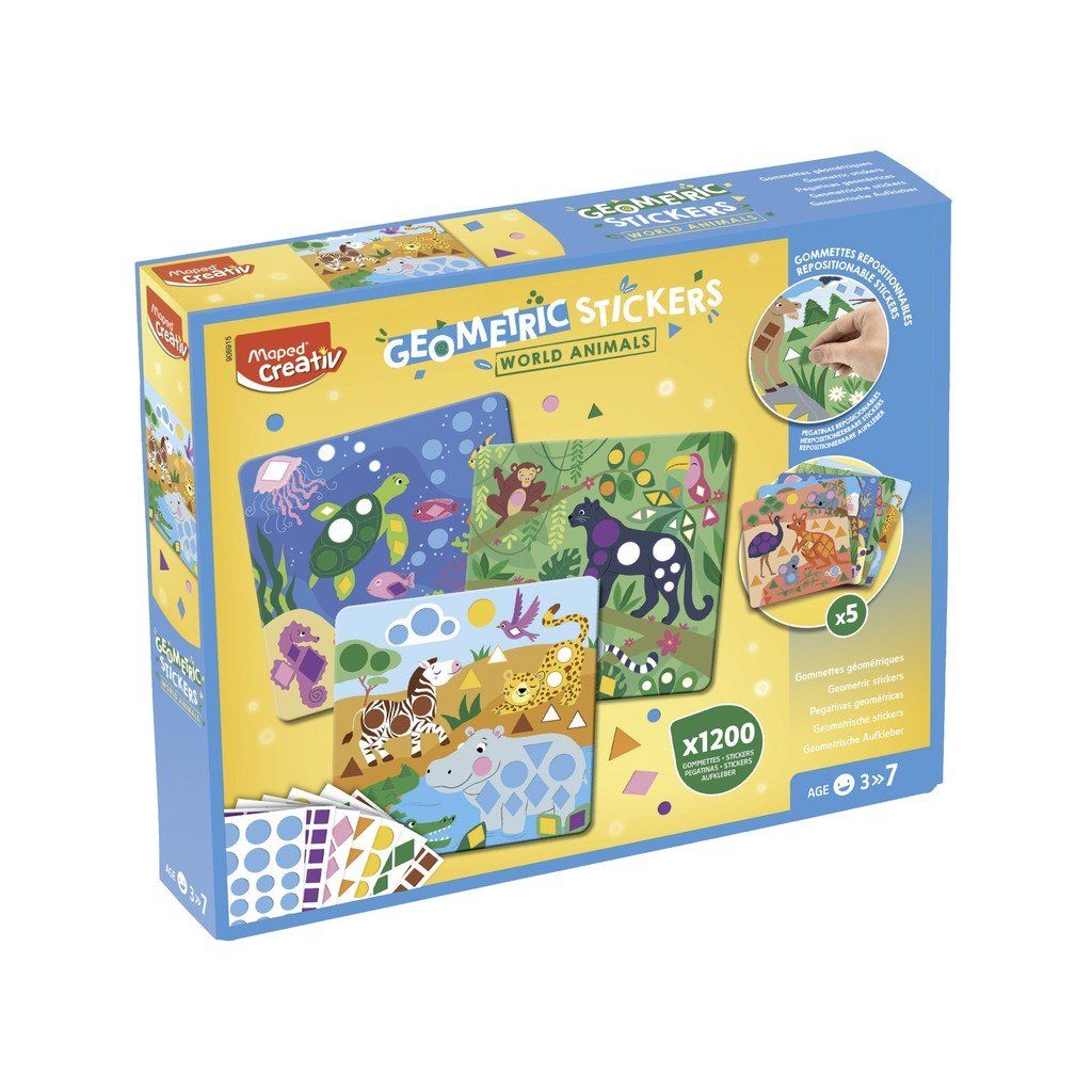 Kreativní sada Maped Creativ Geometric Stickers World Animals zve děti na objevnou cestu za zvířaty z celého světa prostřednictvím zdobení pěti barevných kartiček pomocí více než 1 200 geometrických samolepek. Bohatá paleta tvarů a barev dává prostor kreativitě a samolepky lze použít nejen na kartičky, ale i kamkoli jinam. Hravou formou si děti rozvíjejí jemnou motoriku i pozorovací schopnosti a díky přemístitelným samolepkám se nemusí bát chyb.