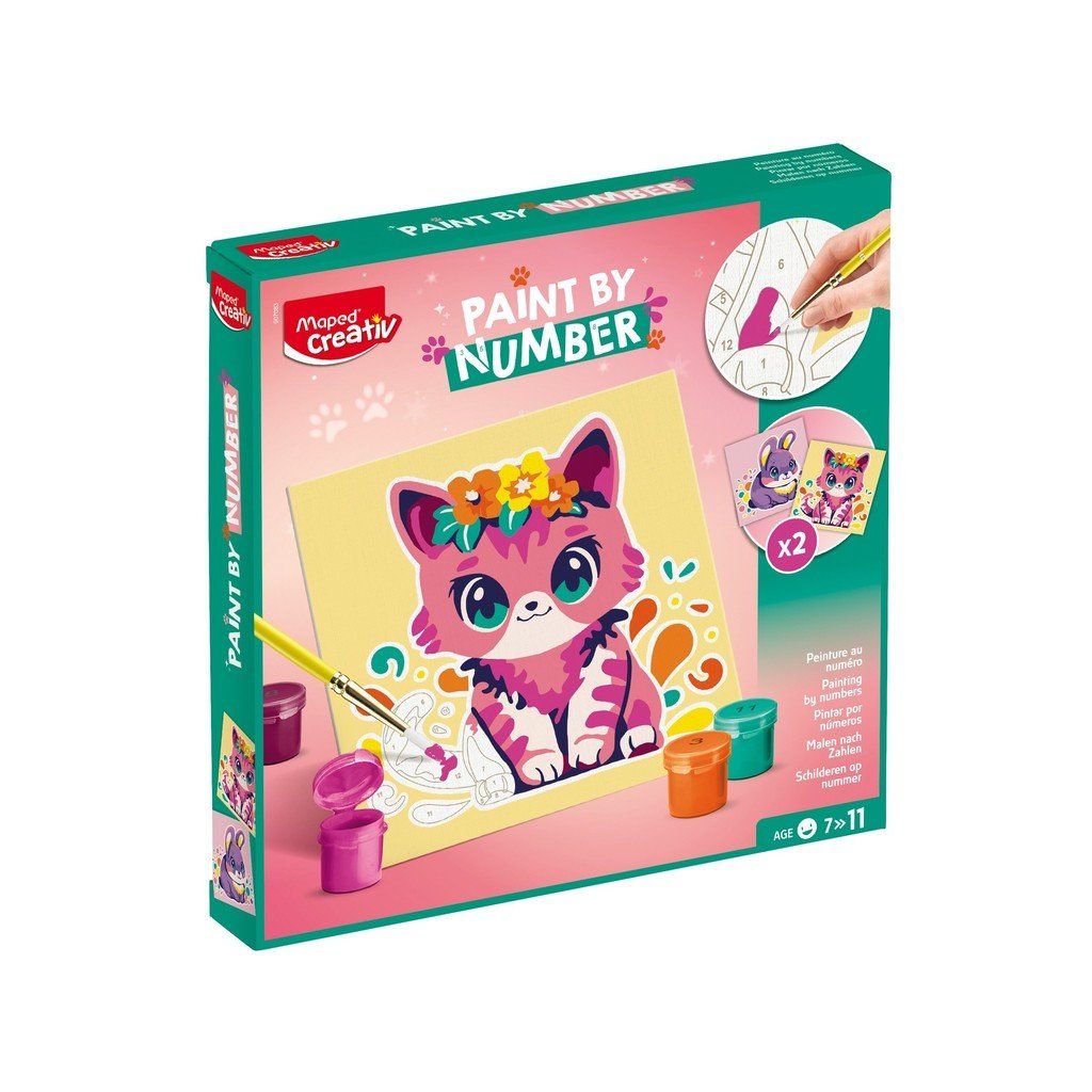 Kreativní sada Maped Creativ Paint by number s motivy kočky a králíka k vytváření krásných obrázků pomocí techniky malování podle čísel. Sada obsahuje 2 číslované šablony k vybarvení, 12 lahviček s akrylovými barvami, štětec a rámeček pro vystavení obrázku.