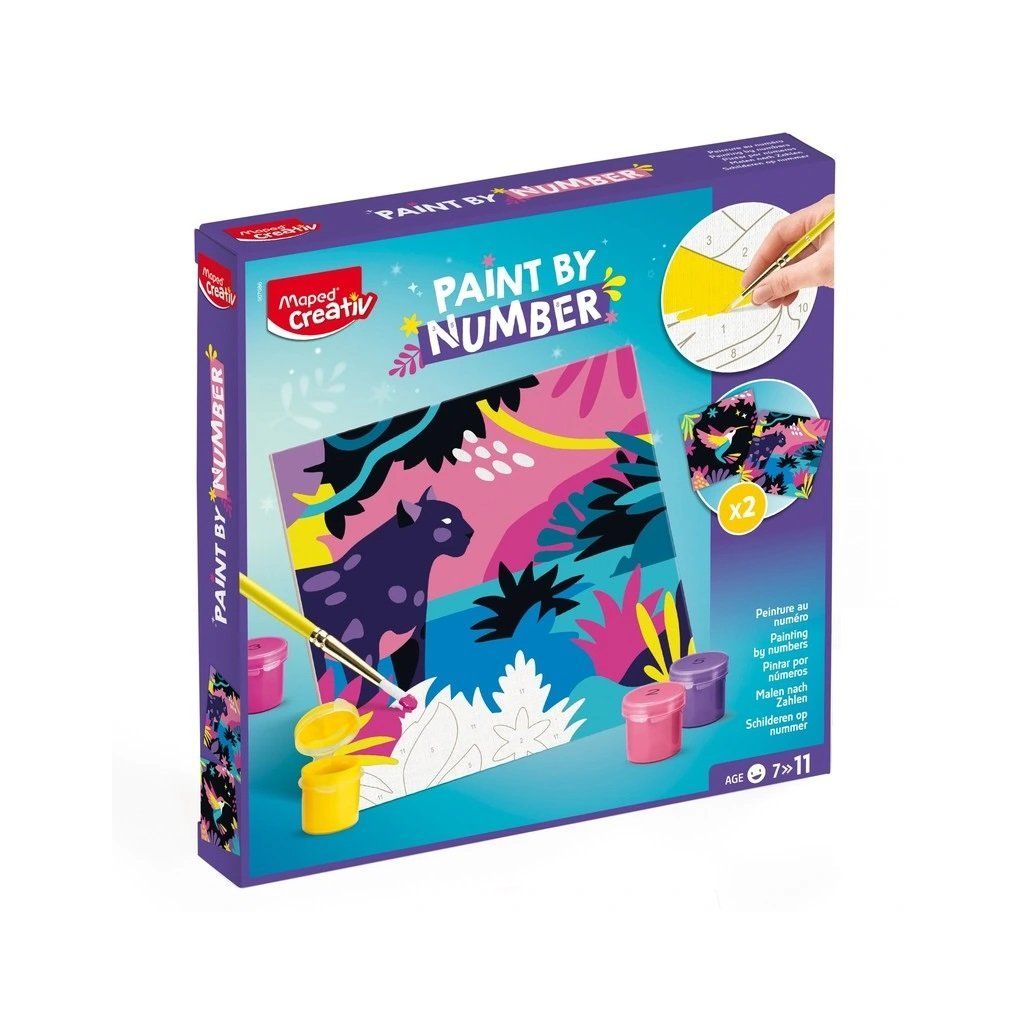 Kreativní sada Maped Creativ Paint by number s motivy leoparda a ptáka k vytváření krásných obrázků pomocí techniky malování podle čísel. Sada obsahuje 2 číslované šablony k vybarvení, 12 lahviček s akrylovými barvami, štětec a rámeček pro vystavení obrázku.