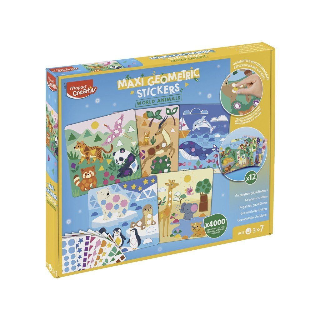 Kreativní sada Maped Creativ Maxi Geometric Stickers World Animals zve děti na objevnou cestu za zvířaty z celého světa prostřednictvím zdobení dvanácti barevných kartiček pomocí více než 4 000 geometrických samolepek. Široká škála tvarů a barev podporuje volnou kreativitu a samolepky lze lepit nejen na kartičky, ale i kamkoli jinam. Děti si při tvoření hravou formou rozvíjejí jemnou motoriku i pozorovací schopnosti a díky přemístitelným samolepkám se nemusí bát chyb.