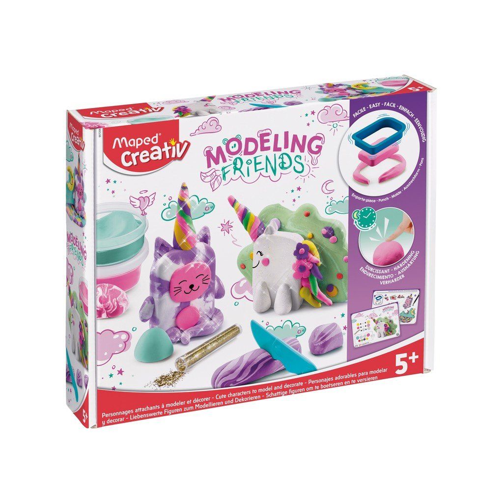 Dětská kreativní sada Maped Creativ Modeling Friends Magical na modelování pomocí tvarovací formy. Vymodelujte si a ozdobte roztomilé figurky. Sada obsahuje tvarovací formu, modelovací hmotu ve 4 základních barvách (4 x 18g) a ve 4 doplňkových barvách v plastové nádobce (1 x 31g), černý fix, plastový nožík, 2 barevné předlohy a tubu zlatých flitrů na zdobení.