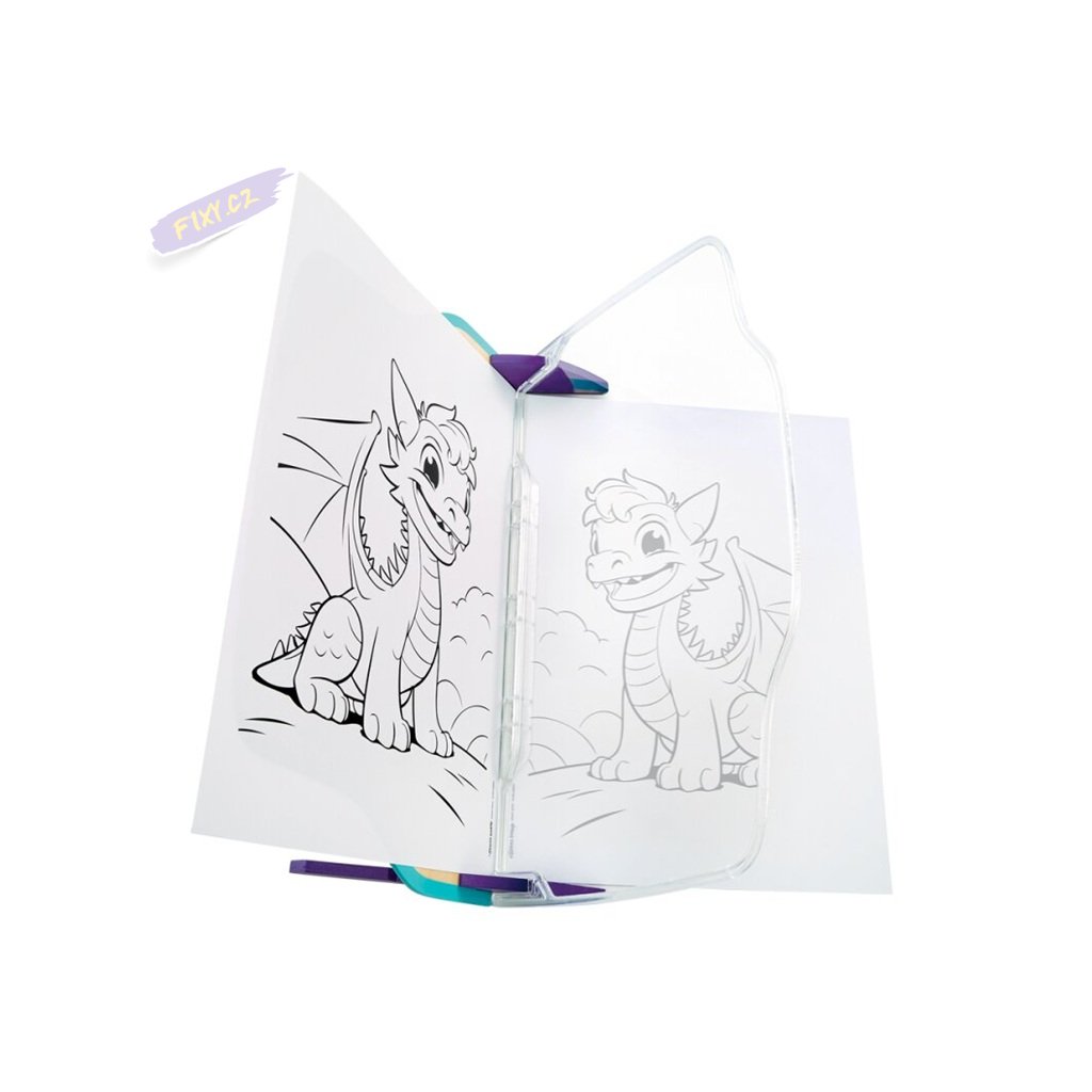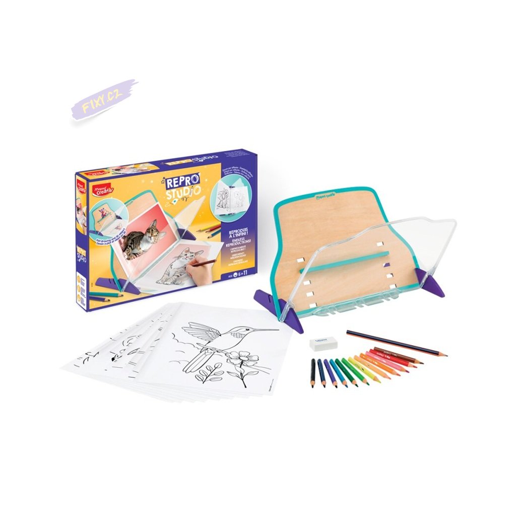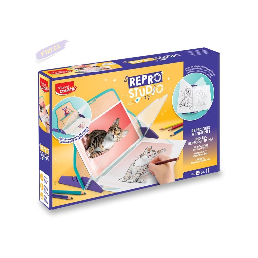 Kreativní sada MAPED Creativ Repro Studio umožňuje dětem snadno a zábavně reprodukovat svět kolem sebe pomocí optického odrazu přes sklo. Stačí umístit obrázek, fotografii nebo předmět na podložku, podívat se skrz speciální skleněnou desku a motiv se „kouzelně“ objeví na papíře. Děti tak mohou obkreslovat jak ploché obrázky, tak i trojrozměrné předměty. Konstrukce je navržena pro pohodlné používání praváky i leváky. Ideální pro rozvoj kreativity, kreslířských dovedností a pozorovací schopnosti. Vhodné pro děti od 6 let.