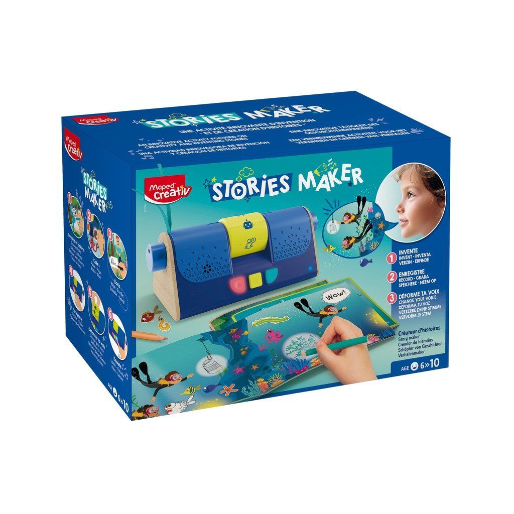 Sada Maped Creativ Stories Maker umožňuje dětem rozvíjet jejich představivost zábavnou tvorbou příběhů. Sada obsahuje 3 sešity, které lze přizpůsobit vybarvením, psaním a pomocí samolepek. Děti pak mohou nahrát svůj příběh a pomocí 7 zkreslovačů hlasu ztělesňovat různé postavy. S 80 minutami nahrávacího času, který je k dispozici, se děti mohou mnohokrát nahrát a pak se znovu a znovu poslouchat.