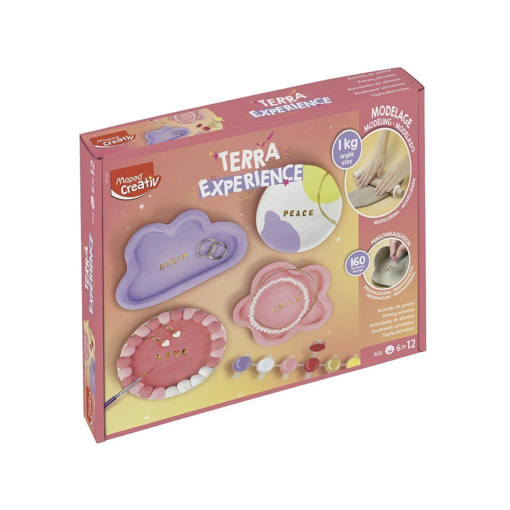Kreativní sada Maped Creativ Terra Experiences Deco Creativ Kit umožňuje dětem vymodelovat a dozdobit čtyři vlastní originální výrobky krok za krokem podle ilustrovaných karet. Pomocí 160 razítek mohou na jednotlivé výrobky psát osobní vzkazy a dodat jim jedinečný vzhled. Sada podporuje samostatnou práci díky přehledným návodům, minimalizuje nepořádek díky omezenému použití vody a nabízí dlouhodobé využití díky možnosti dokoupení náhradní modelovací hmoty.