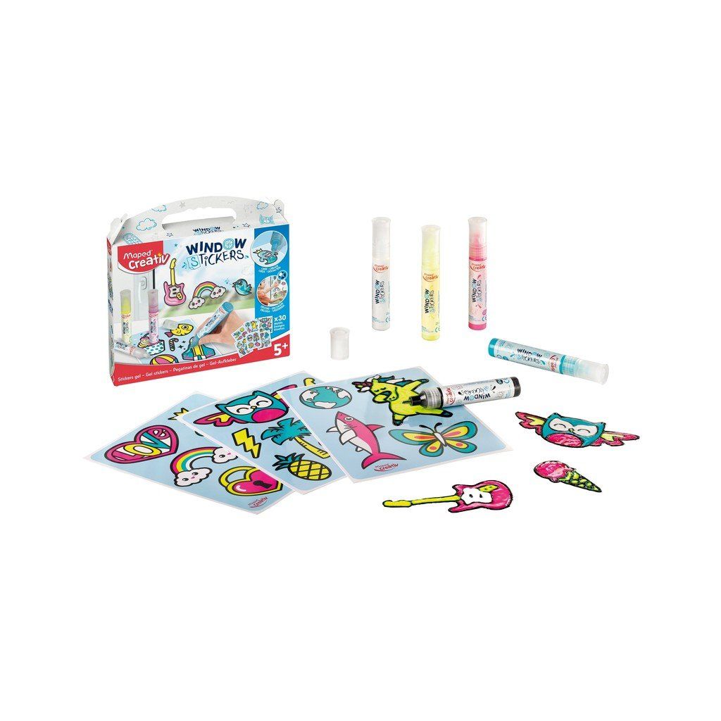 Kreativní sada Maped Creativ obsahuje 30 šablon a 5 tub s barvou pro vytvoření vlastních samolepek na okno. Dají se použít i na lednici, monitor či display telefonu. Přilnou také na porcelán a glazovanou keramiku. Šablony mají trendy motivy. Jemný hrot tuby zajišťuje přesné kontury.