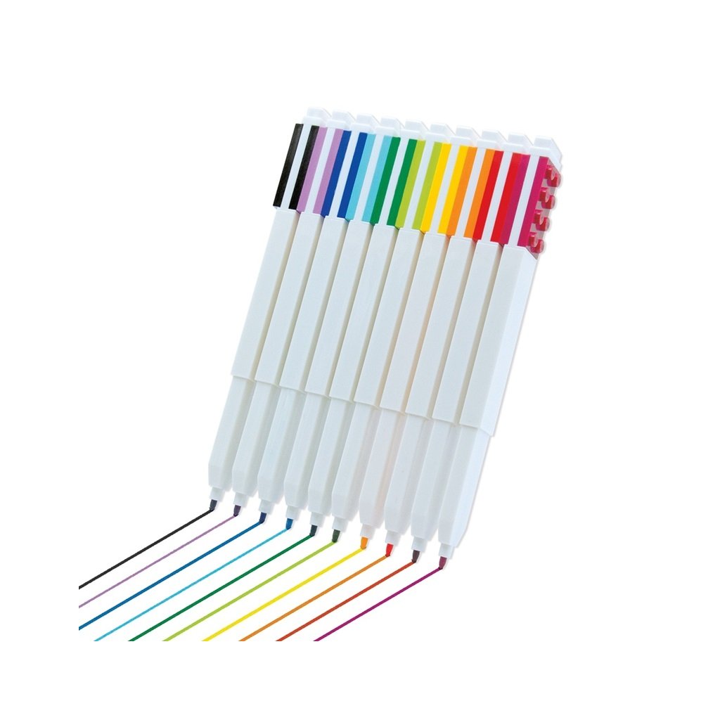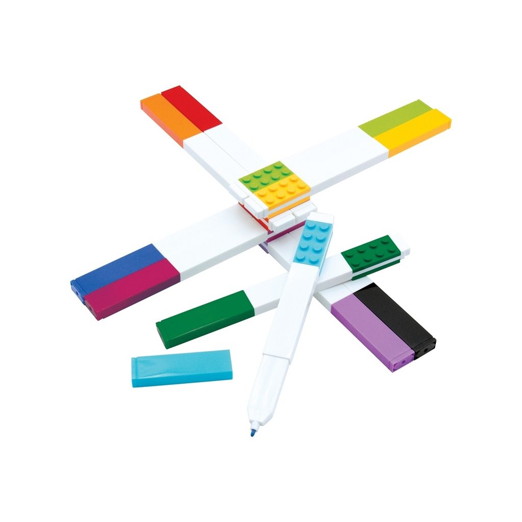 LEGO fixy různých barev (mix 10 barev). Součástí fixů jsou 2 LEGO destičky pro spojení např. s LEGO pouzdrem, minifigurkou, jiným perem nebo k nacvaknutí na LEGO pravítko.