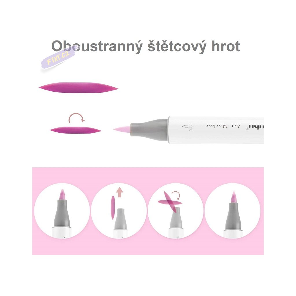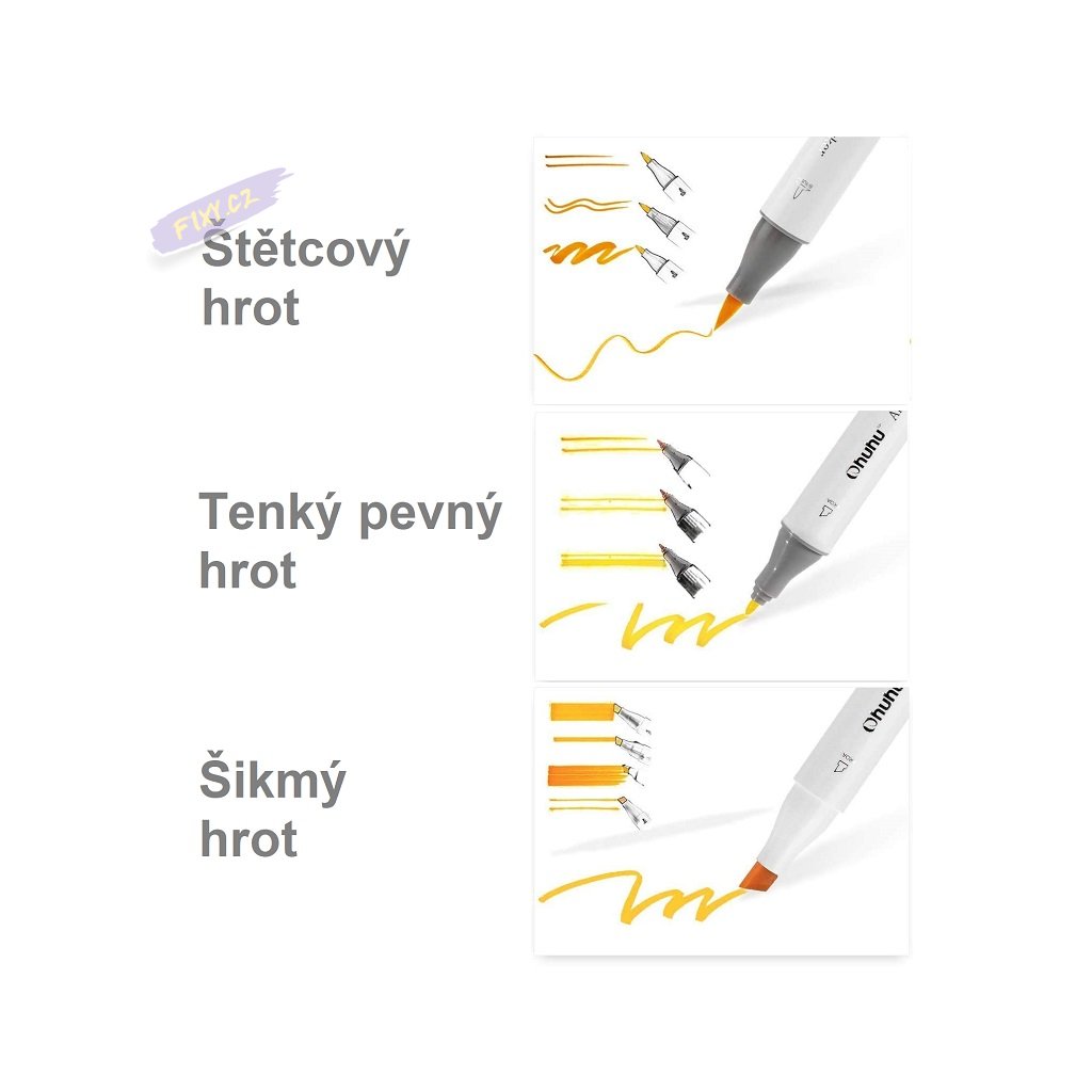 Oboustranné popisovače OHUHU na bázi alkoholu s flexibilním štětcovým hrotem na jedné straně a šikmým hrotem na straně druhé.