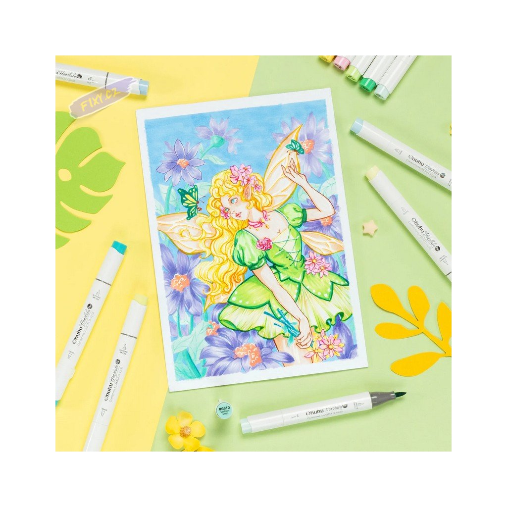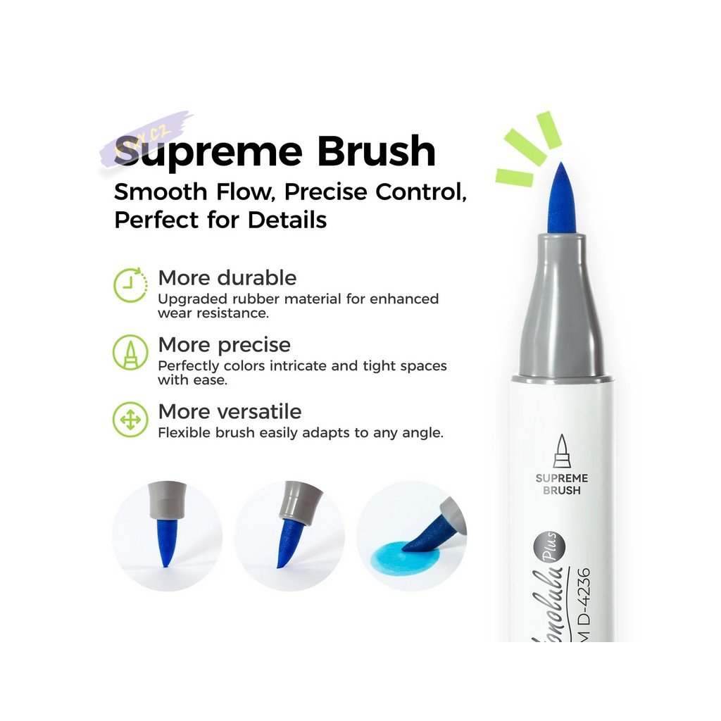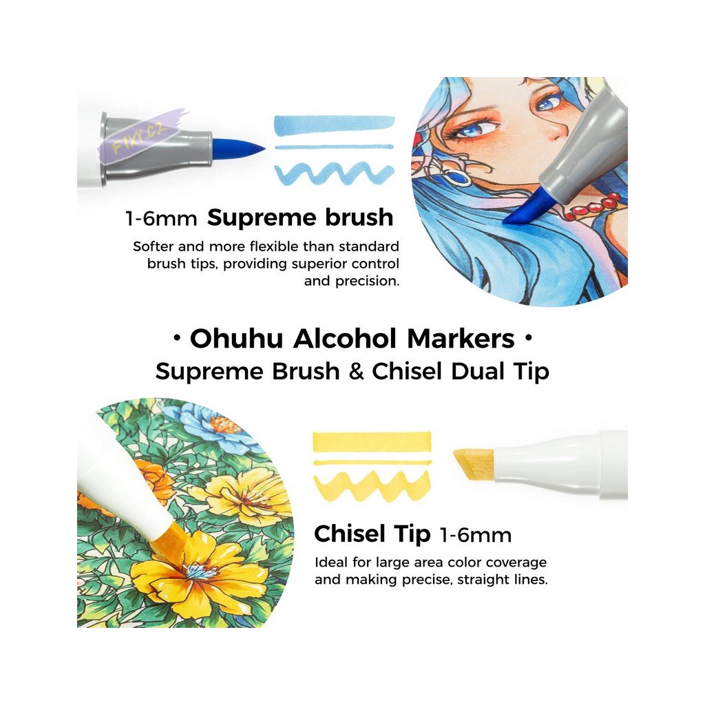 Oboustranné popisovače OHUHU na bázi alkoholu s vylepšeným flexibilnějším štětcovým hrotem na jedné straně a šikmým hrotem na straně druhé.