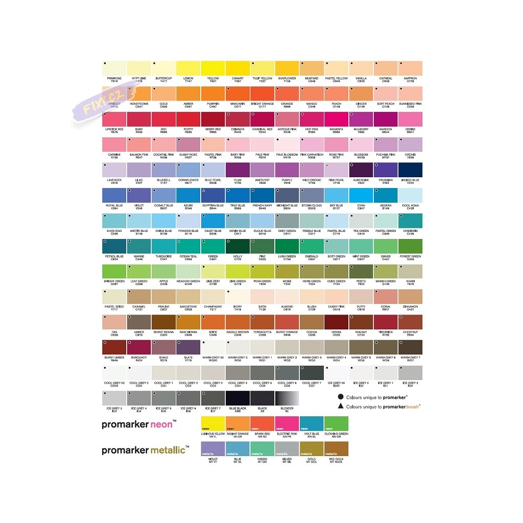 173 lehce průhledných barevných odstínů Promarker je možné vrstvit, aby se dosáhlo různé hloubky a neprůhlednosti odstínů. Přechod přes stejné místo vytváří tmavší tón stejné barvy, což umožňuje univerzální škálu efektů stínování. Navíc je možné pomocí bezbarvého "blenderu" zesvětlit nebo sloučit několik barev dohromady.