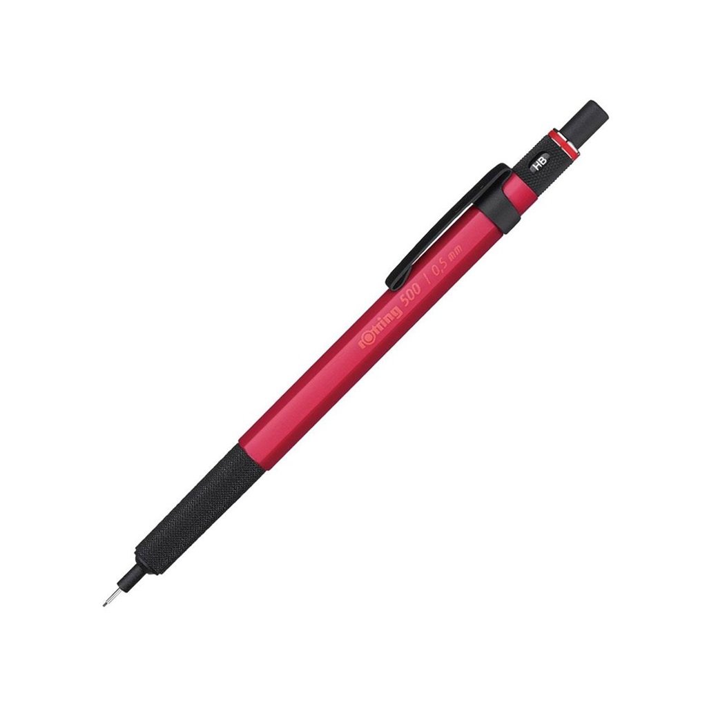 Mikrotužka ROTRING 500 má matně lakované plastové šestiboké tělo s protiskluzovou rýhovanou úchopovou částí.