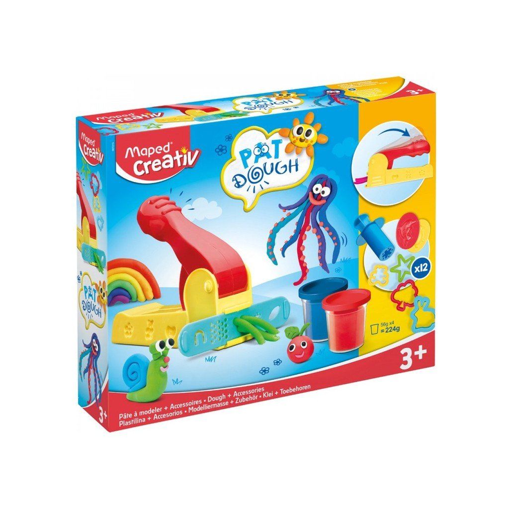 Dětská kreativní sada Maped Creativ Modeling Pat Dough na modelování pomocí tvarovací formy. Hmota uzavřená v kelímku nevysychá, je dlouho dobře tvarovatelná. Sada obsahuje tvarovací formu, modelovací hmotu ve 4 základních barvách v plastové nádobce, plastový nožík, 2 pravítka na tvarování, 4 vykrajovátka, 2 zdobičky, 2 formičky se zvířecím motivem.