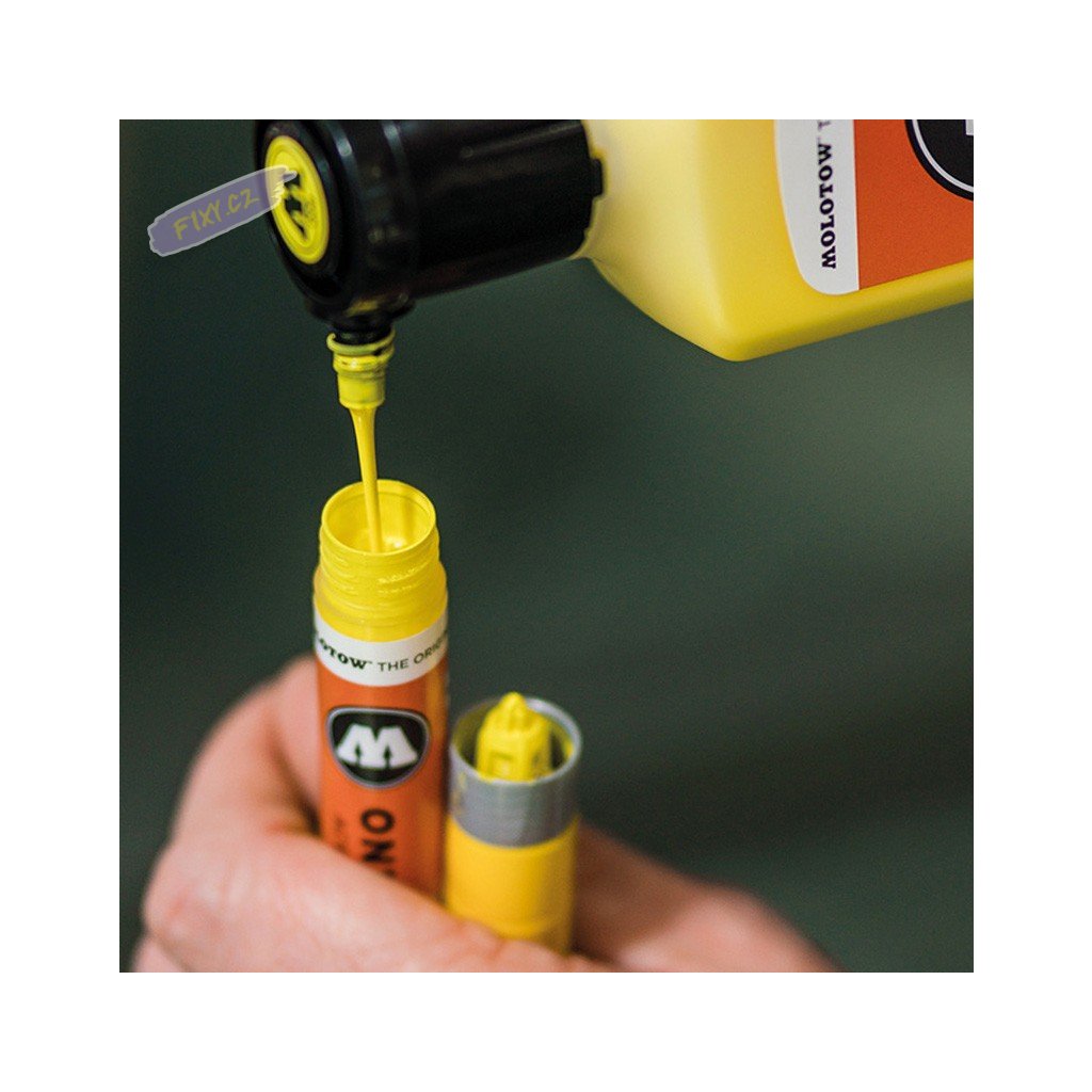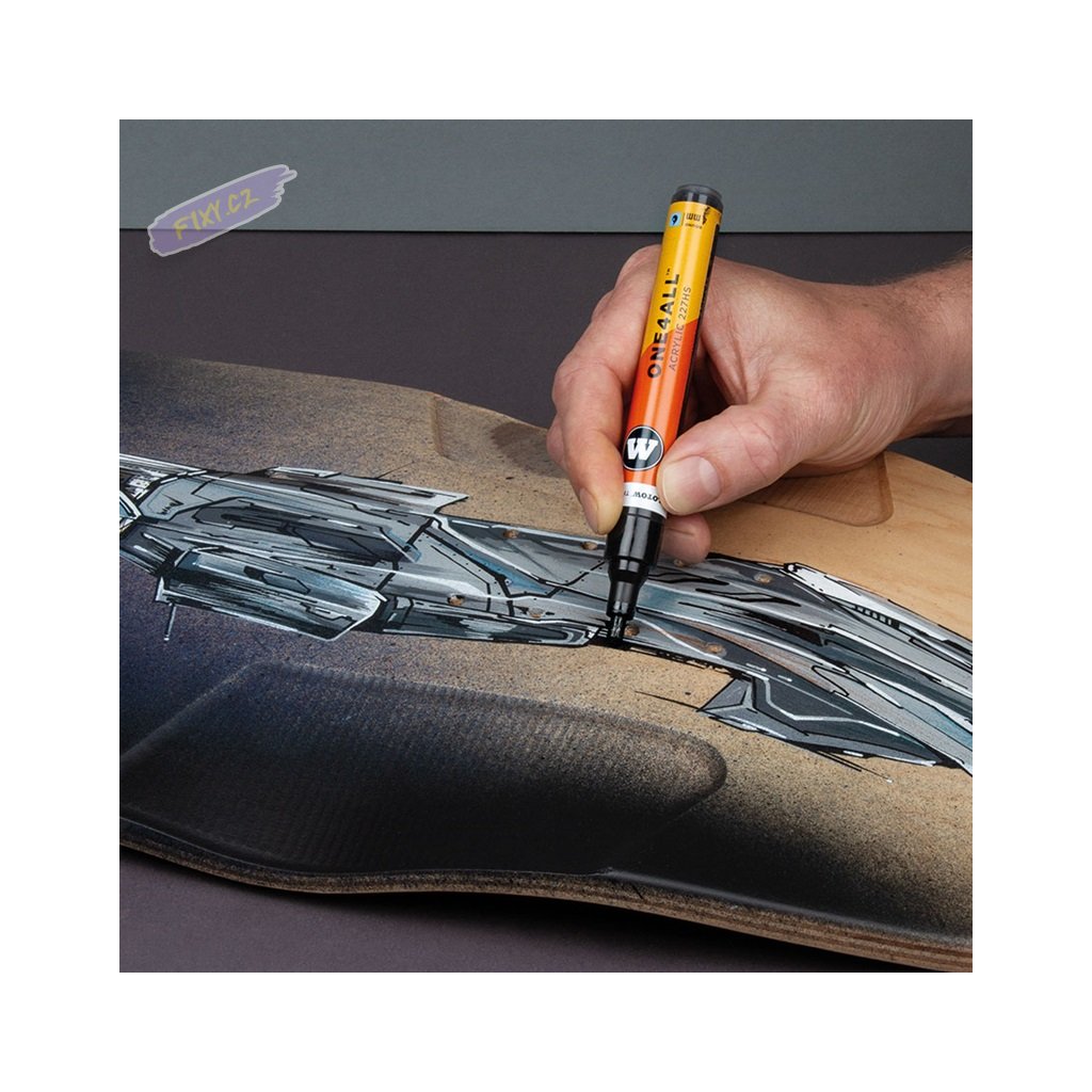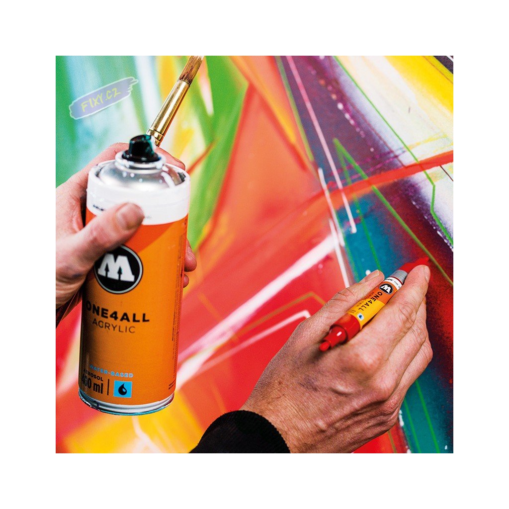 Pumpovací akrylová fixa Molotow ONE4ALL je vybavena vyměnitelným hrotem a je k dispozici až v 76 různých barvách a po vypsání ji lze znovu naplnit inkoustem. Vysoce krycí a permanentní inkoust je odolný proti UV záření a trvanlivý téměř na všech površích. Je zkonstruován tak, aby jeho popisovače šli znovu naplnit a byly vždy spolehlivé a funkční. Ať už malujete na dřevo, plátno, kov, zeď, sklo nebo textil - nic není nemožné. Individuální barevné odstíny lze snadno namíchat díky náhradním inkoustům. Efektové barvy (fluorescentní a metalické) dělají vybarvování ještě atraktivnější a neměly by chybět v sortimentu žádného umělce. Pro zvýšení odolnosti je vhodné použít fixační laky v matu nebo lesku. Molotow fixy jsou vybaveny patentovaným kapilárním systémem, který umožňuje plynulou distribuci barvy do hrotu a její konstantní rozložení.