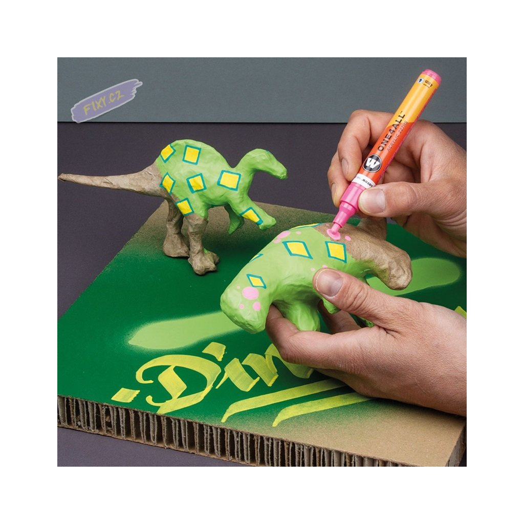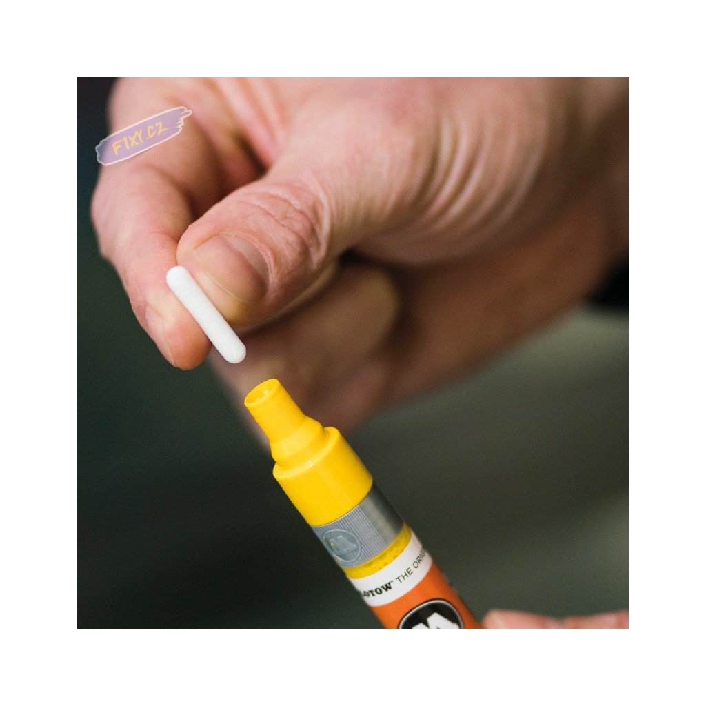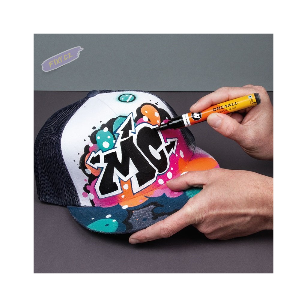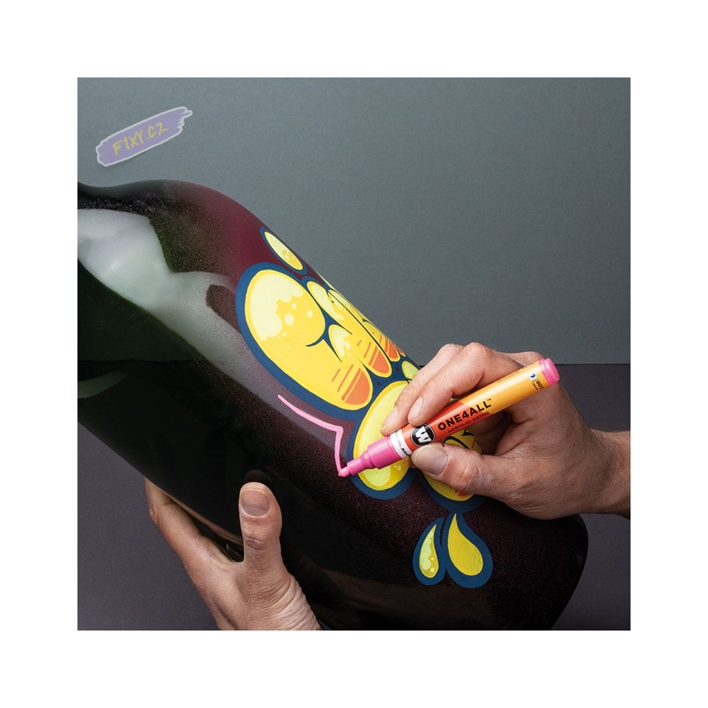 Pumpovací akrylová fixa Molotow ONE4ALL je vybavena vyměnitelným hrotem a je k dispozici až v 76 různých barvách a po vypsání ji lze znovu naplnit inkoustem. Vysoce krycí a permanentní inkoust je odolný proti UV záření a trvanlivý téměř na všech površích. Je zkonstruován tak, aby jeho popisovače šli znovu naplnit a byly vždy spolehlivé a funkční. Ať už malujete na dřevo, plátno, kov, zeď, sklo nebo textil - nic není nemožné. Individuální barevné odstíny lze snadno namíchat díky náhradním inkoustům. Efektové barvy (fluorescentní a metalické) dělají vybarvování ještě atraktivnější a neměly by chybět v sortimentu žádného umělce. Pro zvýšení odolnosti je vhodné použít fixační laky v matu nebo lesku. Molotow fixy jsou vybaveny patentovaným kapilárním systémem, který umožňuje plynulou distribuci barvy do hrotu a její konstantní rozložení.