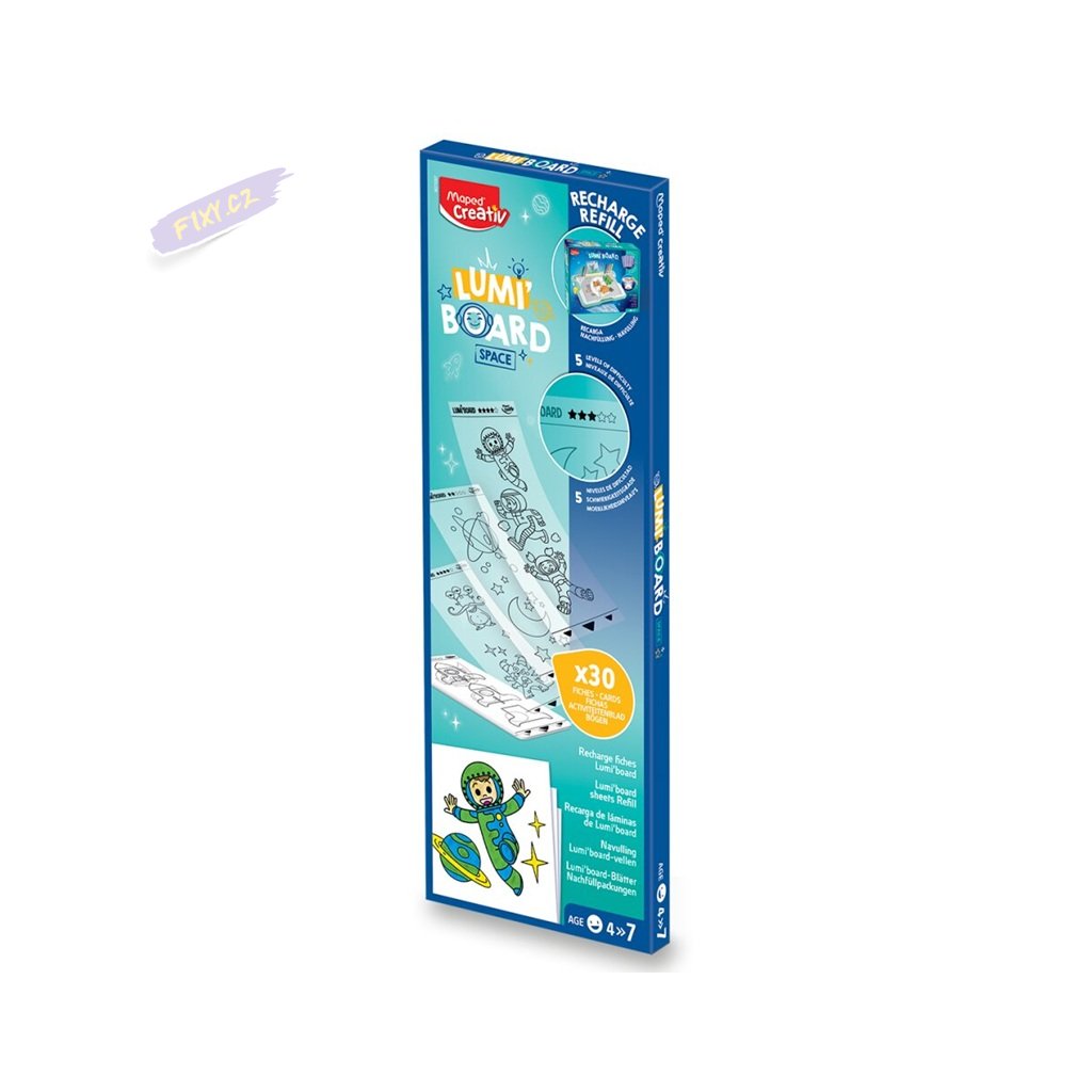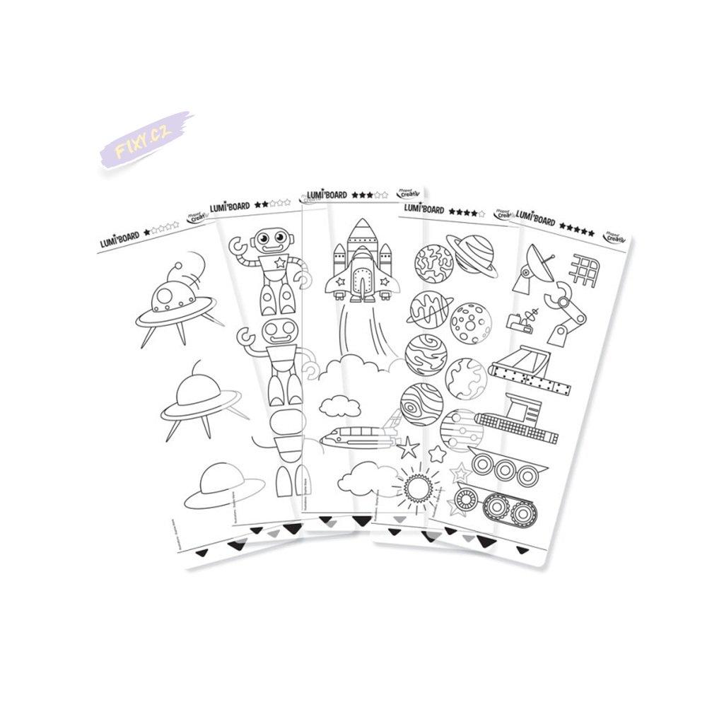 Náhradní náplň do kreativní sady Lumi Board s motivy vesmíru. Sada obsahuje 30 předloh s obrázky v 5 úrovních obtížnosti.