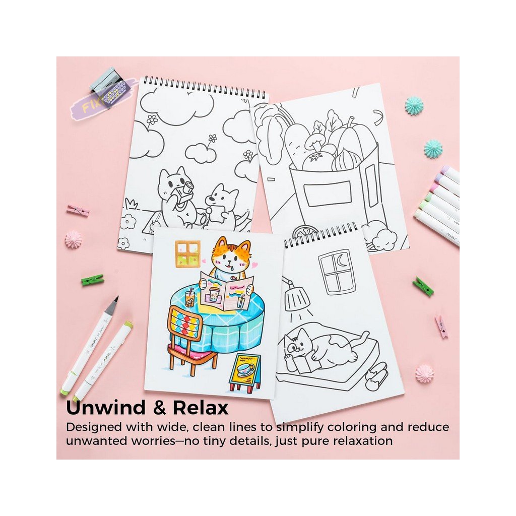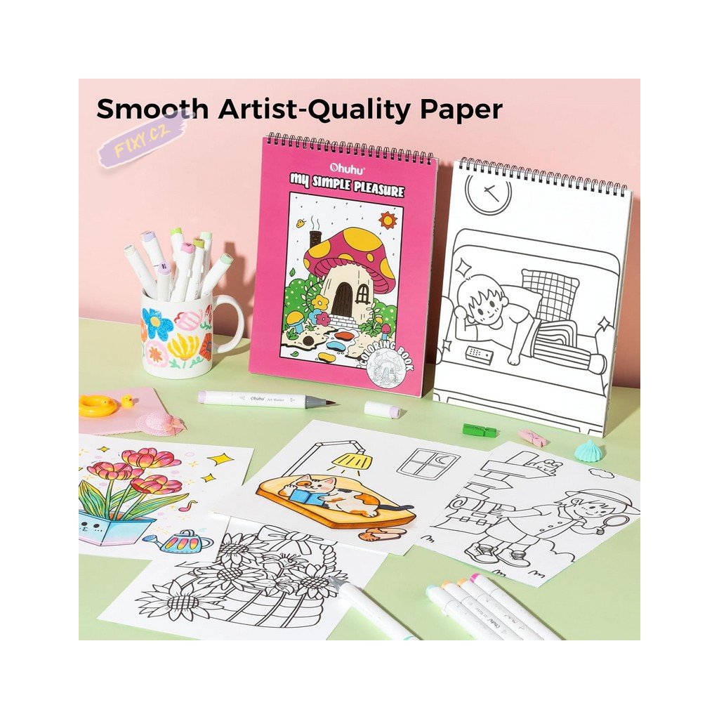 Oboustranné nepropustné omalovánky OHUHU se 40 různými motivy k vymalování pro úlevu od stresu. Praktický rejstřík poskytne ukázku všech vzorů, takže si snadno vyberete další stránku podle nálady nebo si předem naplánujete barevné schéma pro plynulejší a zábavnější tvůrčí proces. Vysoce kvalitní kreslicí papír gramáže 260g/m² s certifikací FSC. Omalovánky OHUHU jsou odolné a udržitelné, hladký a rovný povrch papíru se skvěle hodí k alkoholovým fixám značky OHUHU. I když se doba schnutí inkoustu může mírně lišit ve srovnání s běžným papírem, tak ani začátečníci se nemusí obávat rozpíjení inkoustu. Díky tučným, jednoduchým liniím tento design minimalizuje složité detaily, takže vybarvování je bezstresové a relaxační. Je ideální pro všechny věkové kategorie a pomáhá vám soustředit se na zábavu z vybarvování, aniž byste se cítili zahlceni drobnými detaily. Spirálová vazba umožní otáčení stránek o celých 360 stupňů a kreslit bez problémů z libovolného úhlu. Je ideální pro leváky i praváky a poskytuje plynulý a pohodlný zážitek. Se svými rozměry je tato kniha omalovánek ideální pro focení a sdílení na sociálních sítích. Díky snadno odtrhávacím listům můžete svá umělecká díla rychle vyjmout a darovat přátelům, zarámovat je jako dekoraci nebo si jednoduše užít výjimečné okamžiky, které jste vytvořili.