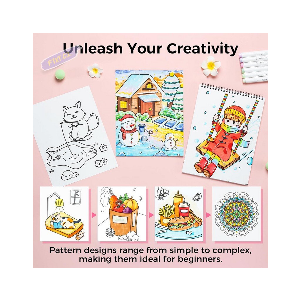 Oboustranné nepropustné omalovánky OHUHU se 160 různými motivy k vymalování pro úlevu od stresu. Praktický rejstřík poskytne ukázku všech vzorů, takže si snadno vyberete další stránku podle nálady nebo si předem naplánujete barevné schéma pro plynulejší a zábavnější tvůrčí proces. Vysoce kvalitní kreslicí papír gramáže 260g/m² s certifikací FSC. Omalovánky OHUHU jsou odolné a udržitelné, hladký a rovný povrch papíru se skvěle hodí k alkoholovým fixám značky OHUHU. I když se doba schnutí inkoustu může mírně lišit ve srovnání s běžným papírem, tak ani začátečníci se nemusí obávat rozpíjení inkoustu. Díky tučným, jednoduchým liniím tento design minimalizuje složité detaily, takže vybarvování je bezstresové a relaxační. Je ideální pro všechny věkové kategorie a pomáhá vám soustředit se na zábavu z vybarvování, aniž byste se cítili zahlceni drobnými detaily. Spirálová vazba umožní otáčení stránek o celých 360 stupňů a kreslit bez problémů z libovolného úhlu. Je ideální pro leváky i praváky a poskytuje plynulý a pohodlný zážitek. Se svými rozměry je tato kniha omalovánek ideální pro focení a sdílení na sociálních sítích. Díky snadno odtrhávacím listům můžete svá umělecká díla rychle vyjmout a darovat přátelům, zarámovat je jako dekoraci nebo si jednoduše užít výjimečné okamžiky, které jste vytvořili.