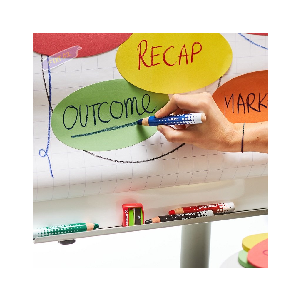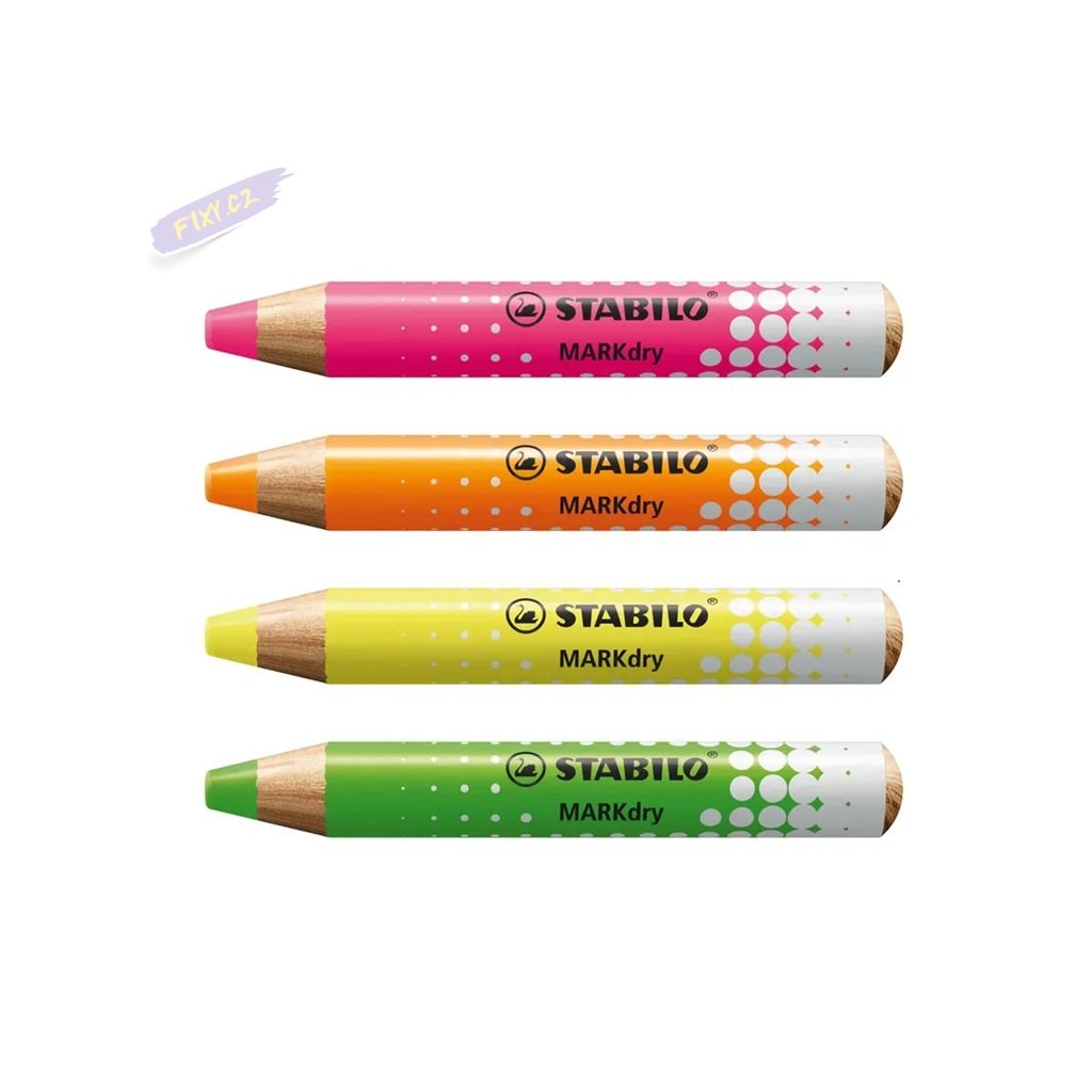 STABILO MARKdry je suchý popisovač se silnou barevnou tuhou na bílé tabule a flipcharty. Píše na papír a hladké povrchy, ze kterých jej lze také otřít nasucho nebo namokro bez zanechání stop. Díky robustnímu hrotu zůstává barva intenzivní až do posledního tahu. STABILO MARKdry v dřevěné pastelce je kdykoliv připraven k použití bez vysychání.
