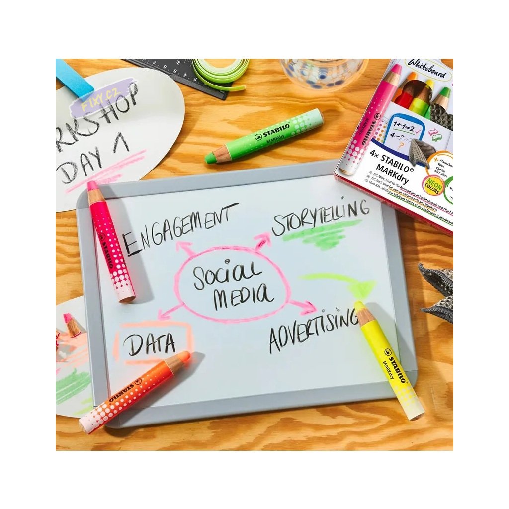 Pastelky STABILO MARKdry na bílé tabule a flipchart, 4ks neon + příslušenství