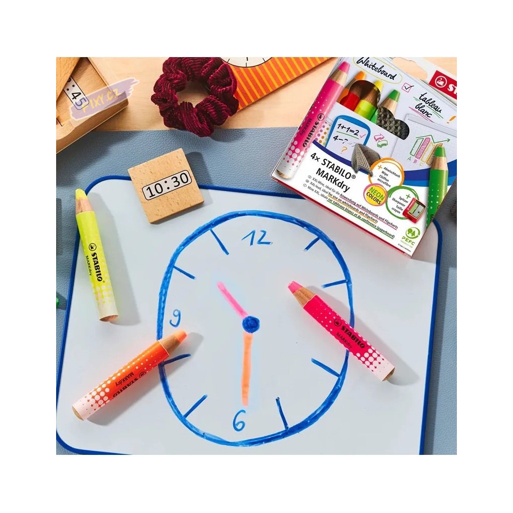 Sada obsahuje: 4x STABILO MARKdry, 1x ořezávátko, 1x hadřík