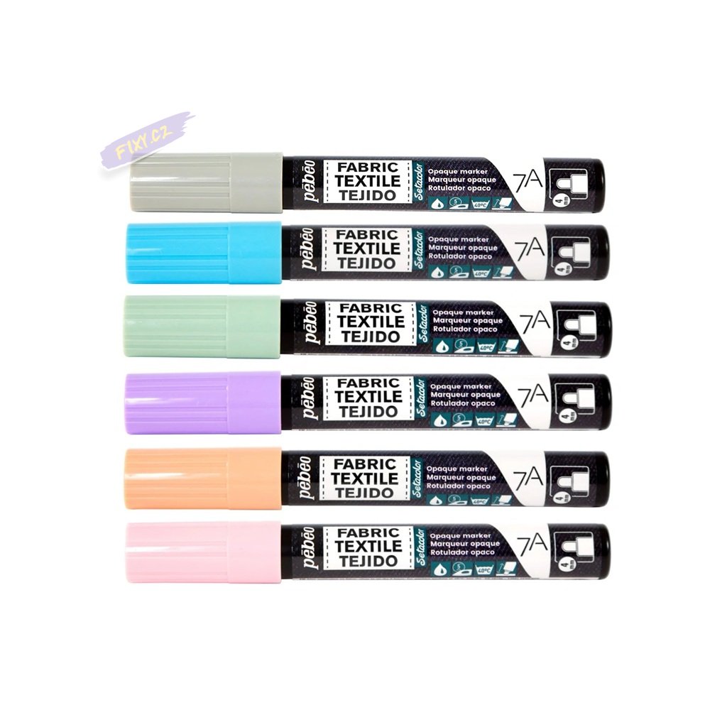 PEBEO 7A Opaque jsou profesionální popisovače na textil. Fixy mají 4mm kulatý hrot pro přesné nanášení barvy a obsahují zářivý, poloprůhledný inkoust vhodný pro aplikaci na světlé a barevné tkaniny. Všechny barvy lze zafixovat nažehlením na rubovou stranu látky po dobu 5 minut (bez páry), poté, co se aplikace nechá 2 hodiny schnout na vzduchu. Po zafixování barvy drží při ručním praní nebo praní v pračce do 40°C. Před použitím dobře protřepejte.