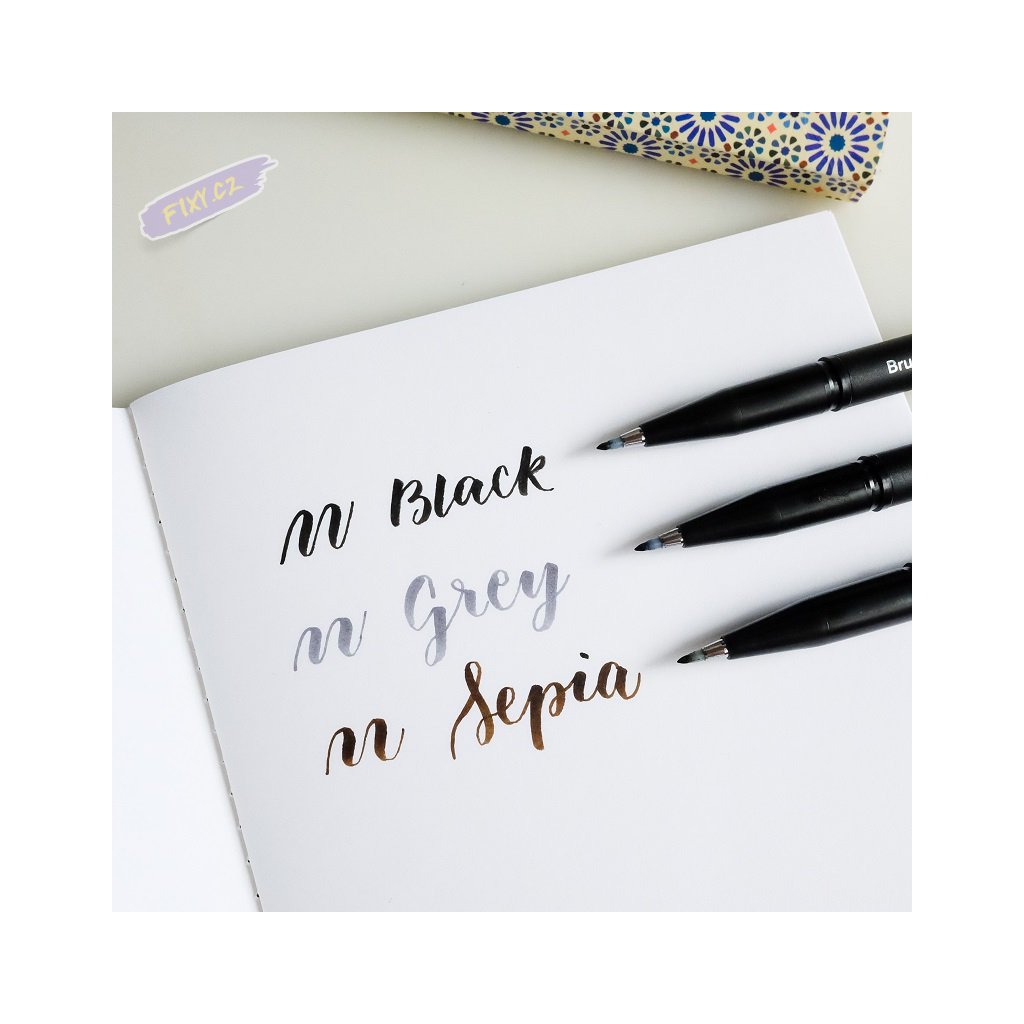 Brushový popisovač se štětcovým hrotem, s jehož pomocí lze regulovat šířku tahu a kreslit linie zhruba od 0,3mm do 2mm. Nepostradatelný společník pro moderní kaligrafii, lettering či ilustrace. Jeho odolný ohebný hrot se jen tak nezničí, a tak je skvělý i pro začátečníky. Pigmentový inkoust na vodní bázi hladce teče, je bez kyselin a je odolný proti vyblednutí a vodě. Popisovač se při vedení tahu snadno ovládá a je příjemný na uchopení.