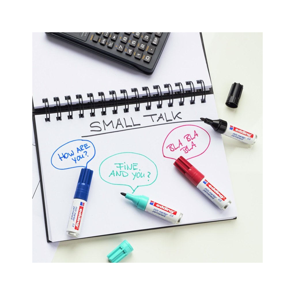 Univerzální permanentní popisovač Edding 0.5 v mini kapesní verzi se využívá pro trvalé značení nejrůznějších povrchů (kov, dřevo, plast, sklo, karton, kůže). Rychleschnoucí, světlostálý, voděodolný a otěru odolný inkoust na alkoholové bázi neobsahuje toluen ani xylen. Díky opravdu malým rozměrům (délka fixu je 7,3cm) se jedná o spolehlivého společníka na cestách i při práci. Mini permanentní popisovače jsou balené v průhledné kapsičce s uzavíráním na zip. Tělo popisovače je vyrobeno z hliníku. Fix je jednorázový, není znovu naplnitelný. Kulatý hrot. Šíře stopy: 1,5-3 mm. Sada 4 barev: černá, modrá, karmínově červená a tyrkysová.