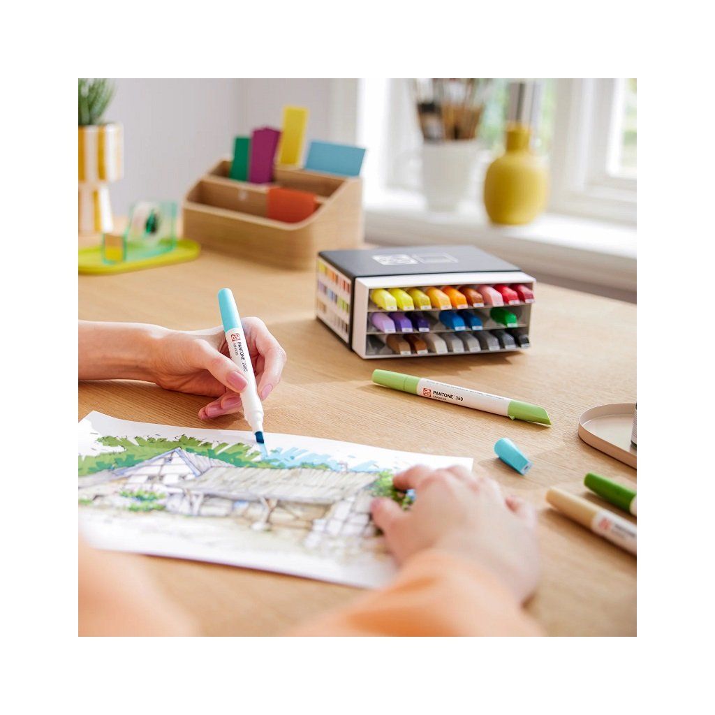 Oživte své nápady a objevte možnosti! Díky názvům barev a číslům na víčku si snadno vyberete tu správnou barvu pro vaši práci. Každý popisovač má dva hroty, které nabízejí maximální flexibilitu: štětcový hrot pro detaily a jemné linky a šikmý hrot pro široké tahy a výrazné barevné plochy. Inkoust rychle schne a po zaschnutí je voděodolný, díky čemuž je ideální pro vrstvení. Popisovače je možné doplňovat pomocí inkoustů PANTONE Ink 30ml.