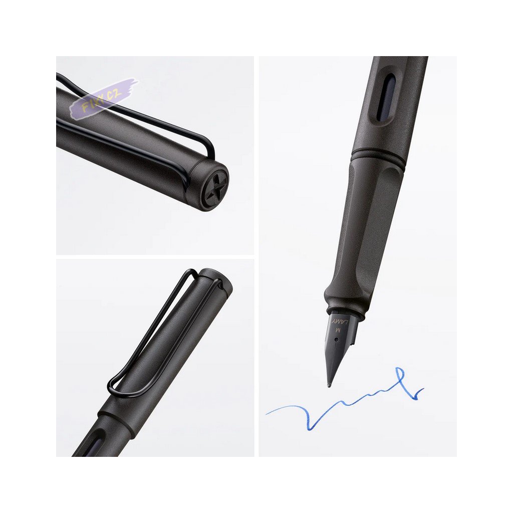 Plnící pero LAMY Safari All Black má tělo z tvrzeného ABS plastu, nasazovací víčko a odpružený kovový klip. Úchopová zóna je ergonomicky upravená. Hrot je z nerezové oceli. Charakteristickým prvkem tohoto pera je ozdobný detail v podobě barevných kroužků umístěných na horní části víčka.