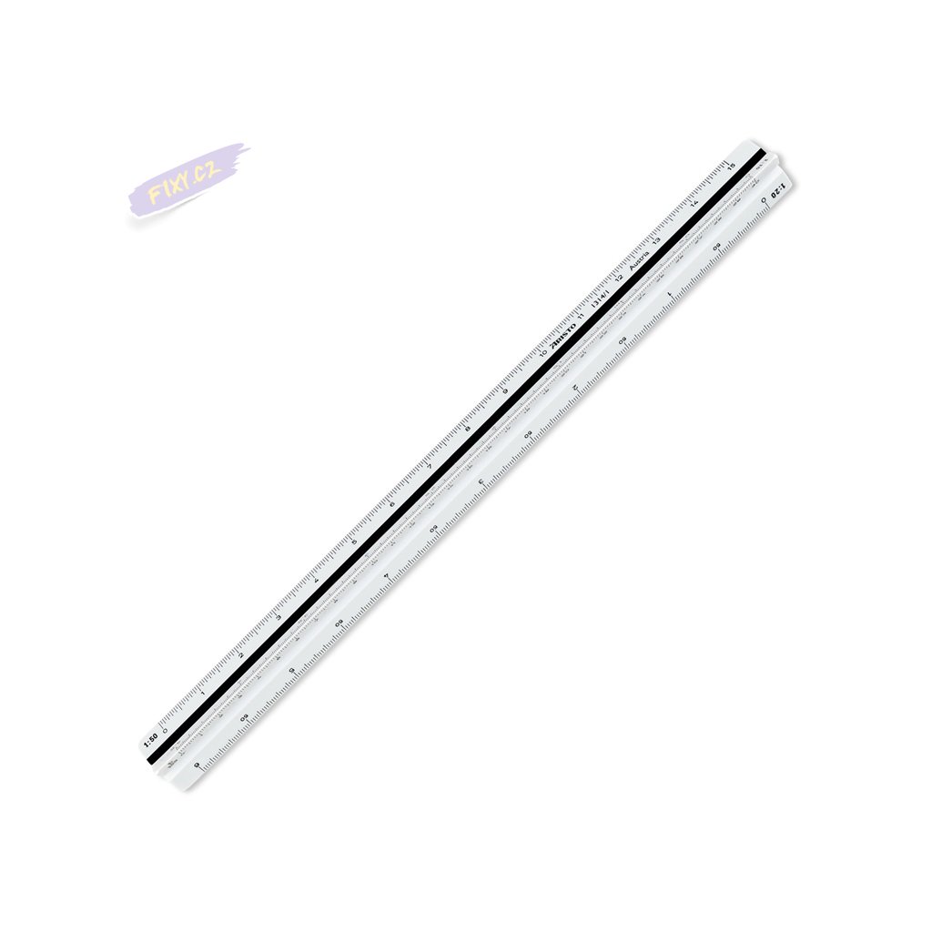 Poměrové trojúhelníkové pravítko ARISTO o délce 30 cm, 3 barevné drážky pomáhají rychleji vybrat potřebný poměr: 1:15, 1:20, 1:25, 1:33, 1:50 a 1:100.