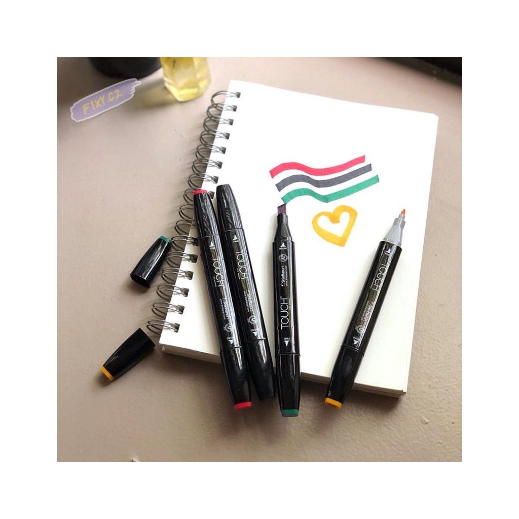Jemný hrot na jedné straně a široký zkosený hrot na straně druhé popisovače TOUCH Twin Marker (bez štětečku) nabízí rozsah tlouštěk čar větší než kdykoliv předtím. Ergonomicky tvarované tělo obdélníkového tvaru braní kutálení se po pracovní ploše a umožňuje pohodlné odložení bez neúmyslných šmouh. Speciálně navržený bezpečnostní uzávěr pevně drží na popisovači a zabraňuje poškození hrotu. Twin Marker obsahuje inkoust na bázi alkoholu, který je rychleschnoucí, netoxický a vodě odolný.